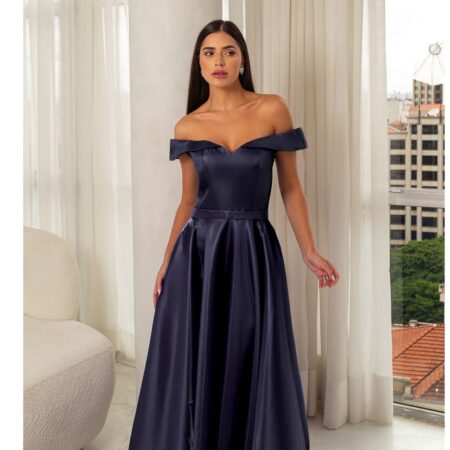 Vestido Denisy Chiffon Ombro A Ombro com Saia Rodada – Marinho
