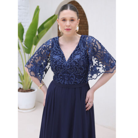 Vestido Regina Chiffon Busto Renda Manga Saia Rodada – Marinho