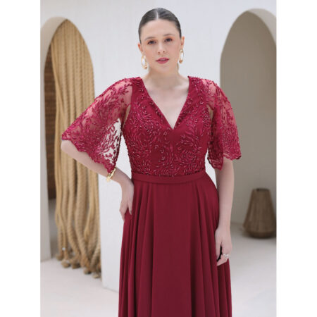 Vestido Regina Chiffon Busto Renda Manga Saia Rodada – Marsala