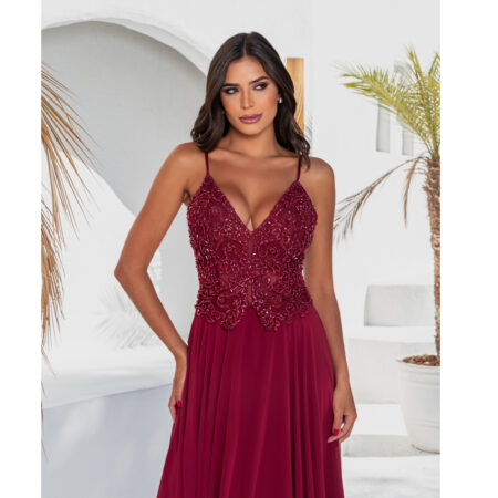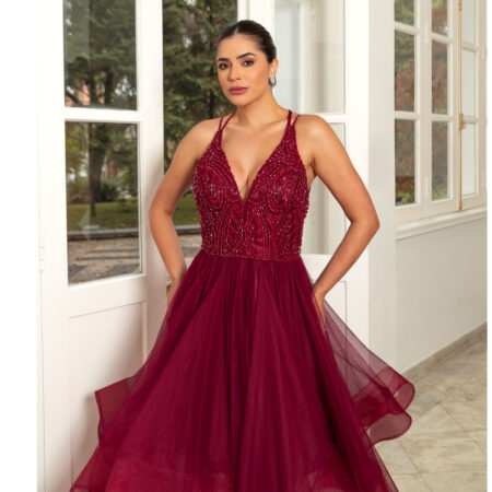 Vestido Reyna Bordado com Alça e Saia Rodada Chiffon – Marsala