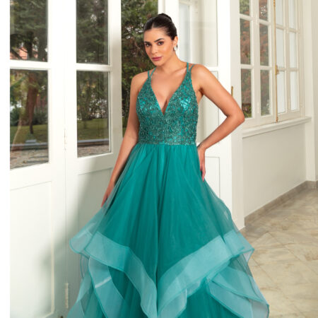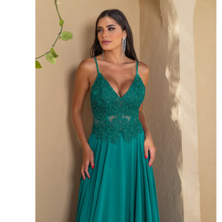Vestido Reyna Bordado com Alça e Saia Rodada Chiffon – Verde Esmeralda