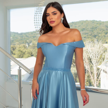 Vestido Bailey Cetim Ombro A Ombro, Pala Bordada e Saia Roda – Azul Ceu