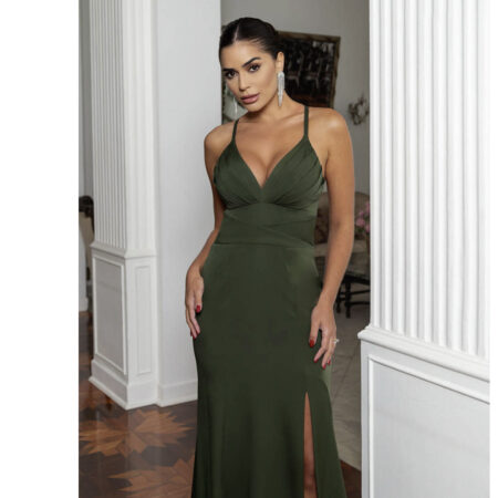 Vestido Gia Alfaiataria Busto Prega, Detalhe Cintura Saia Fenda – Oliva