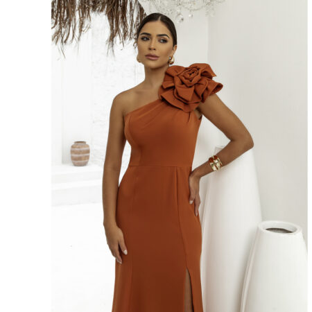 Vestido Lennon Alfaiataria Um Ombro, Detalhe Flor e Saia Fenda – Terra Cota
