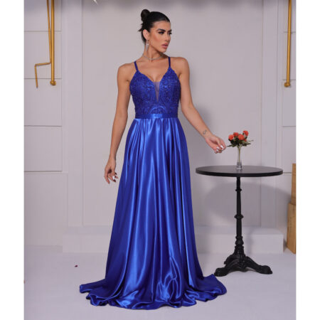 Vestido Athens Bordado, Alça Cruzada e Saia Cetim Rodada – Royal