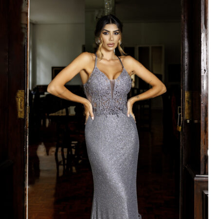 Vestido Brunett Paete Saia Sereia, Costas Trançadas e Busto Aplicado – Prata