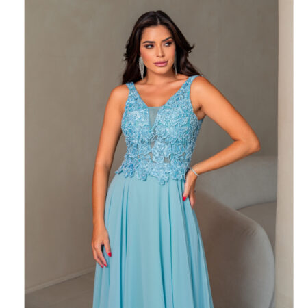Vestido Veda Busto Renda Saia Chiffon Rodado – Azul Céu
