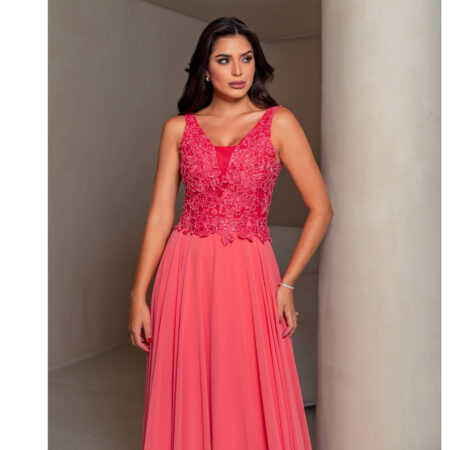 Vestido Veda Busto Renda Saia Chiffon Rodado – Coral