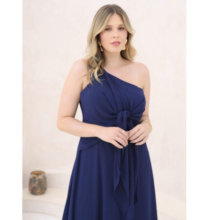 Vestido Kinley Um Ombro, Laço Frontal, Crepe Ggt e Saia Roda – Marinho