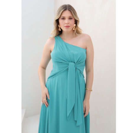 Vestido Kinley Um Ombro, Laço Frontal, Crepe Ggt e Saia Roda – Verde