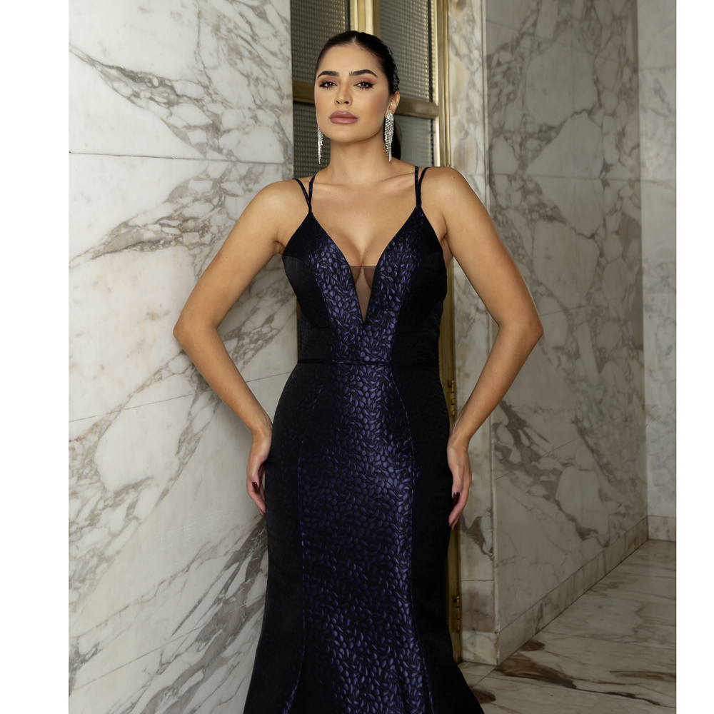 Vestido Andrea Importado, Tecido Jacquard e Saia Sereia – Marinho