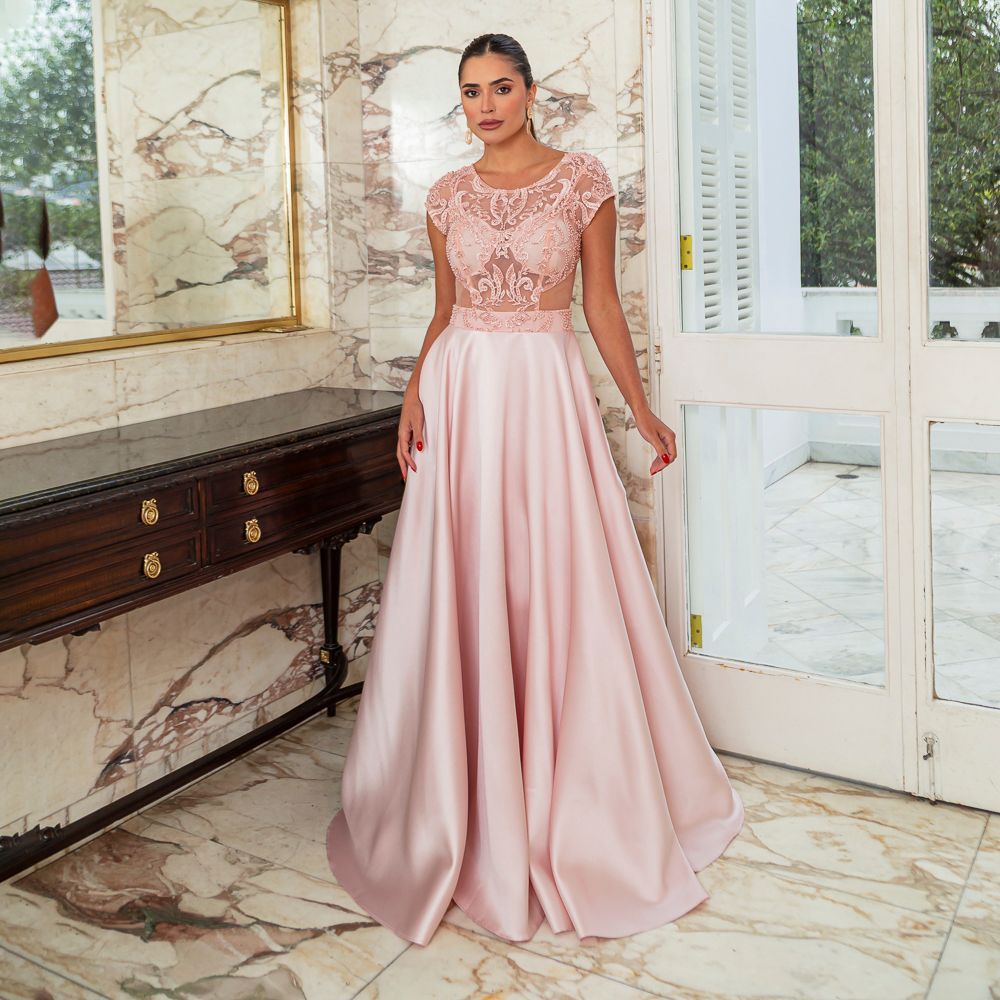 Vestido Aubree Zibeline Busto Bordado e Saia Rodada – Rose