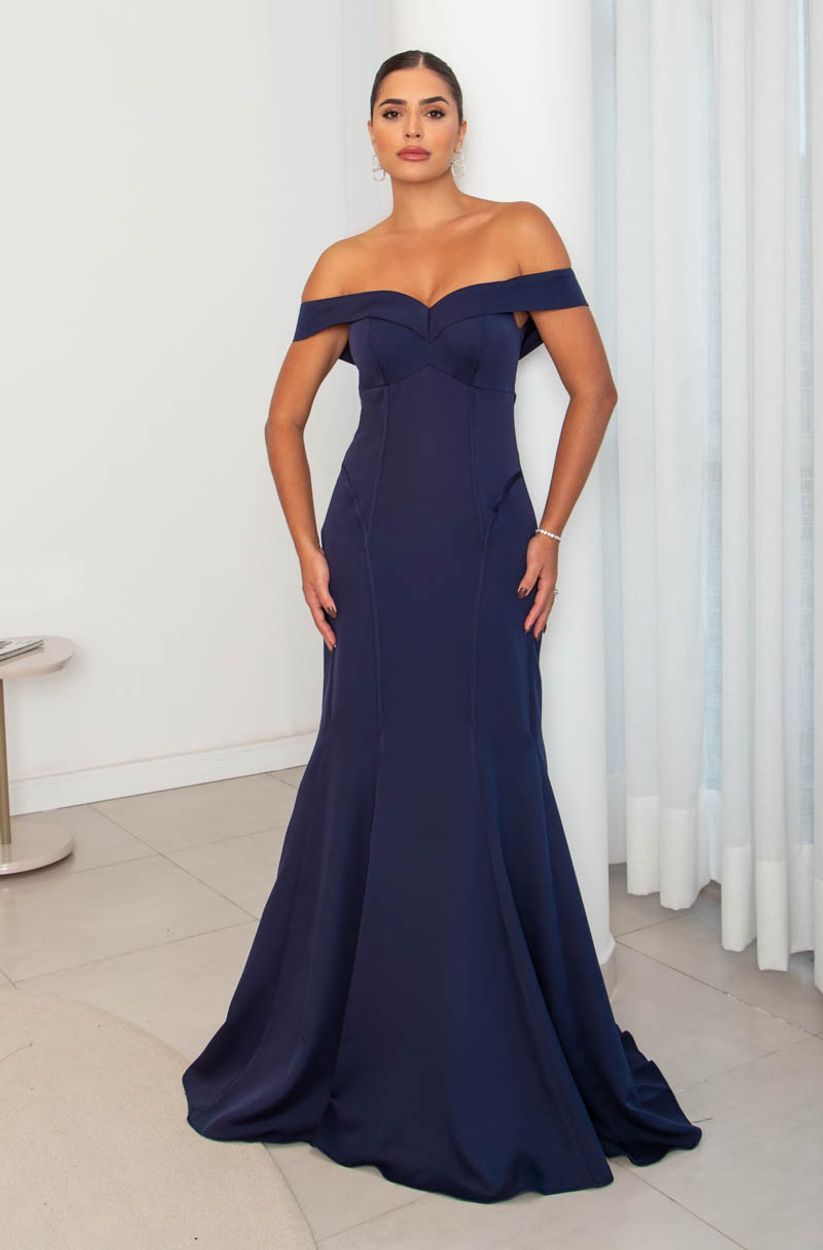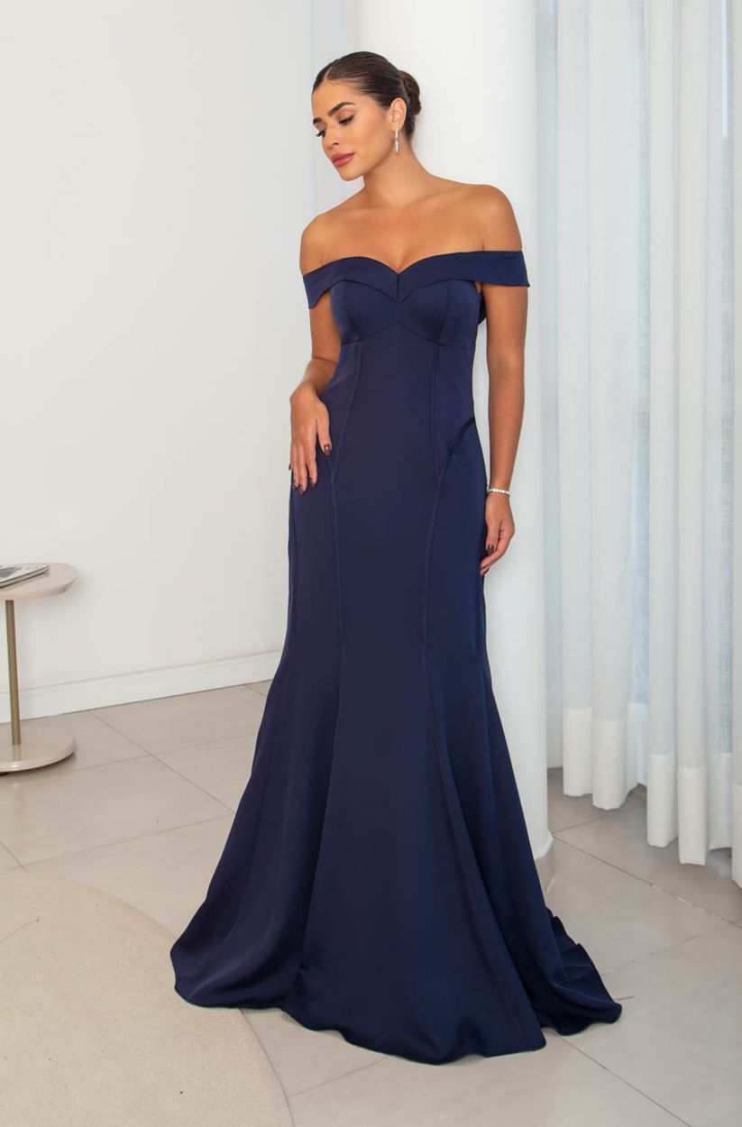 Vestido Aurelia Alfaiataria Ombro A Ombro, Detalhe Vies Na Saia Sereia – Marinho