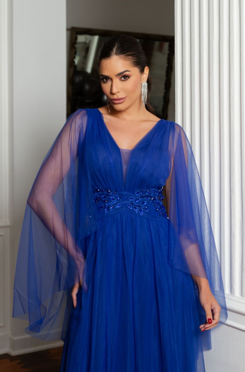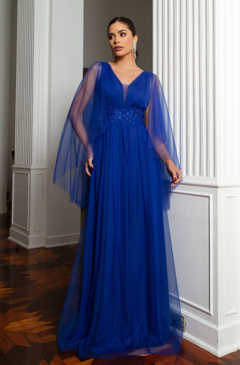 Vestido Aurelia Busto Tule Franzido com Aplicaçâo Lateral – Royal