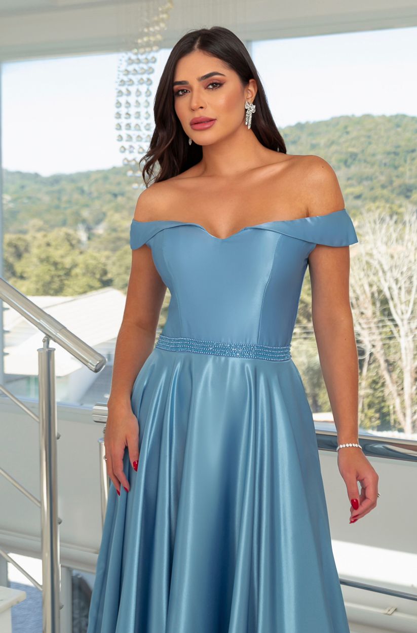 Vestido Bailey Cetim Ombro A Ombro, Pala Bordada e Saia Roda – Azul Ceu