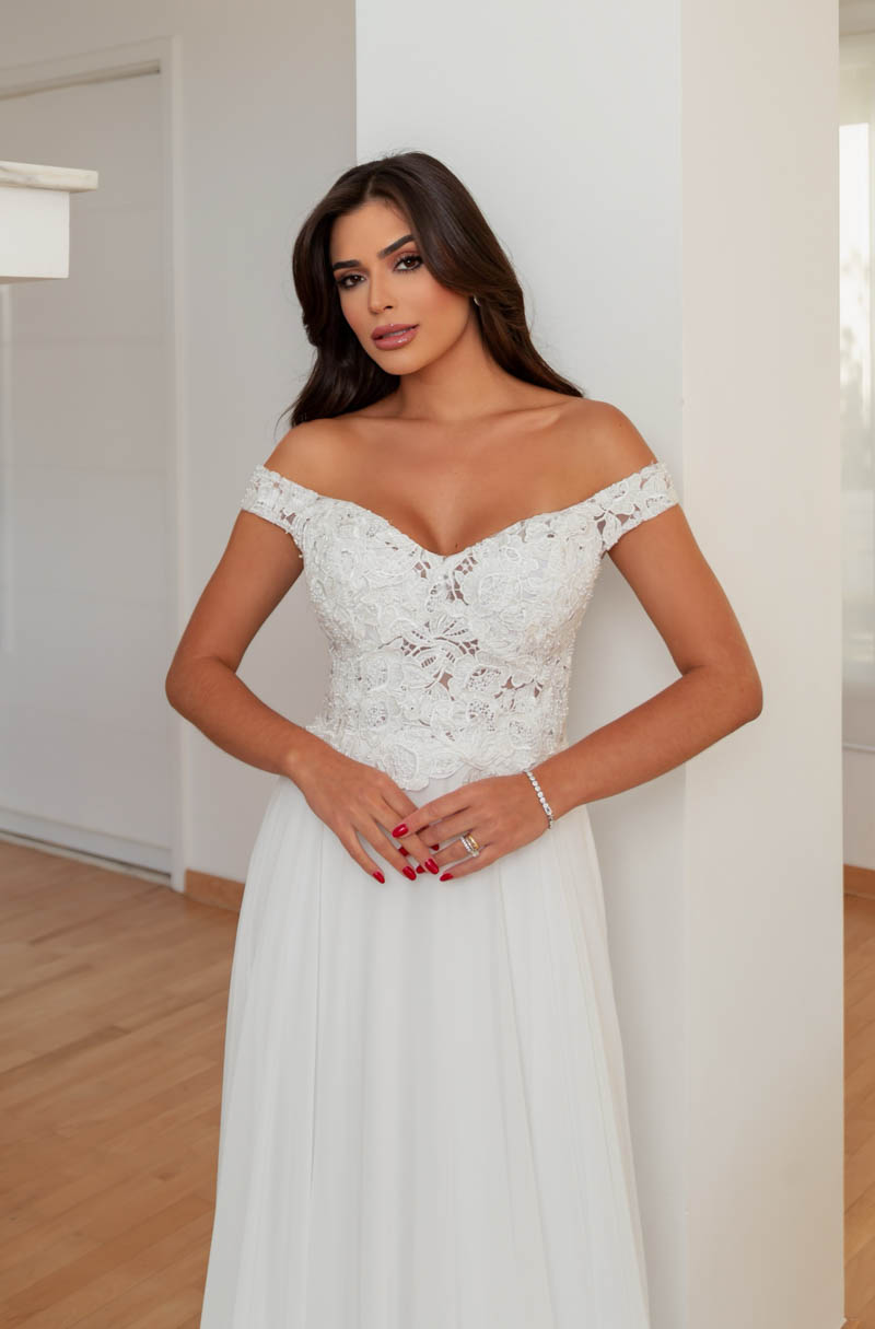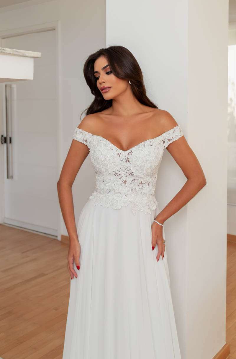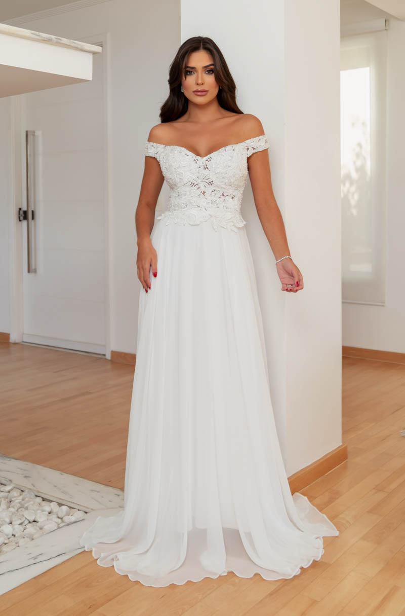 Vestido Cecelia Noiva busto bordado ombro a ombro e saia chiffon rodada