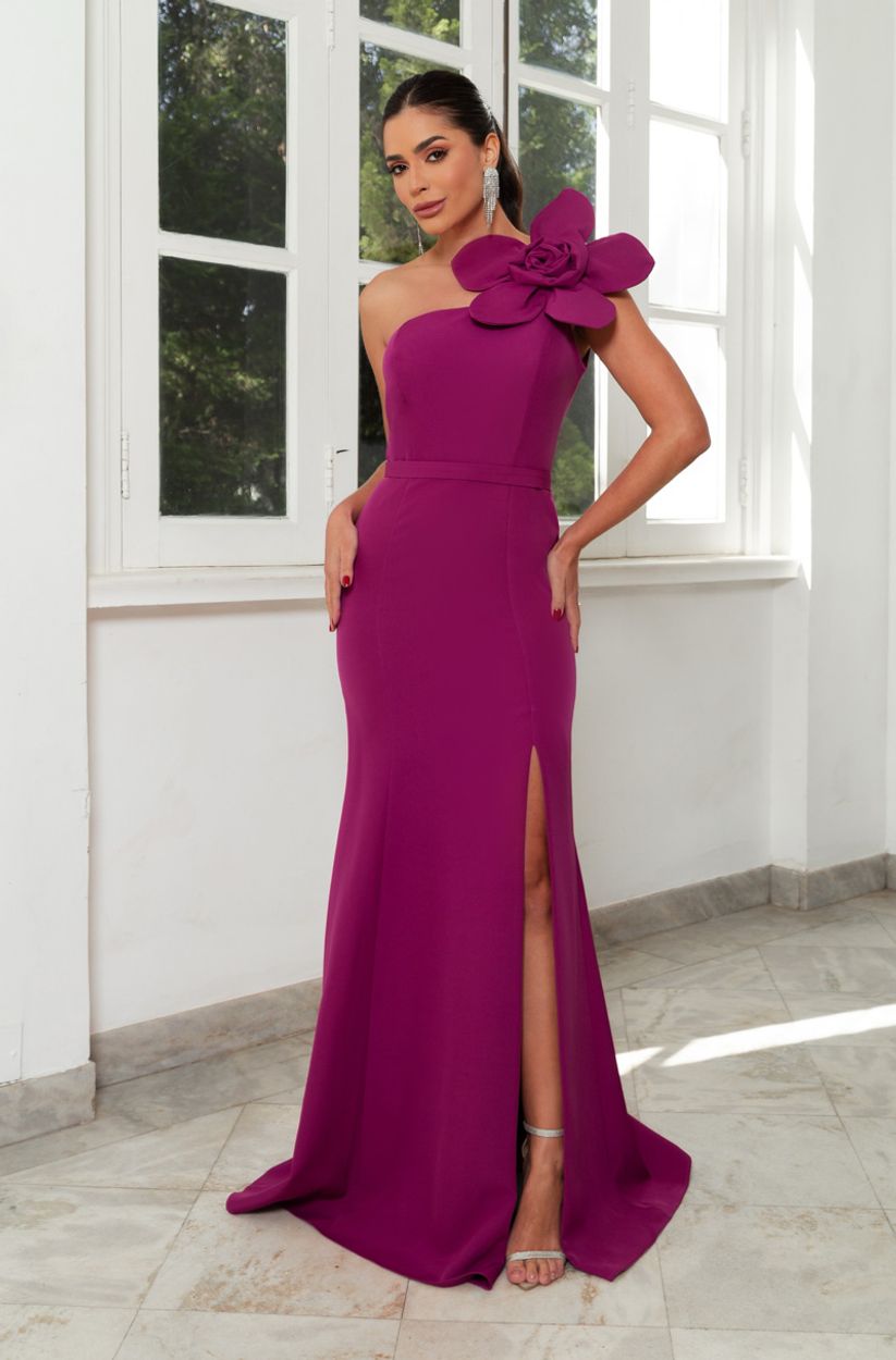 Vestido Daisy Alfaiataria Detalhe Flor Um Ombro, Cinto e Saia Fenda – Fuchsia