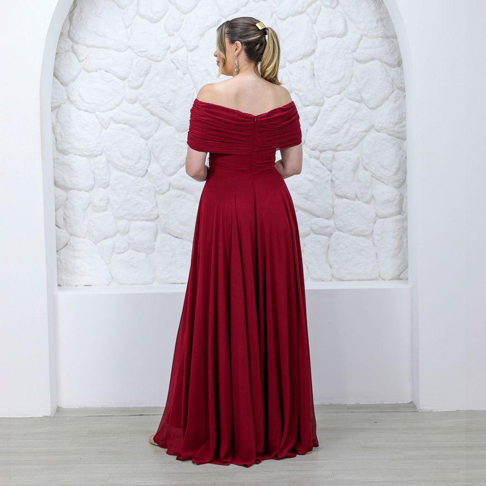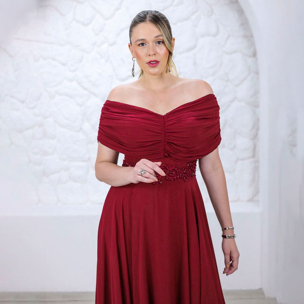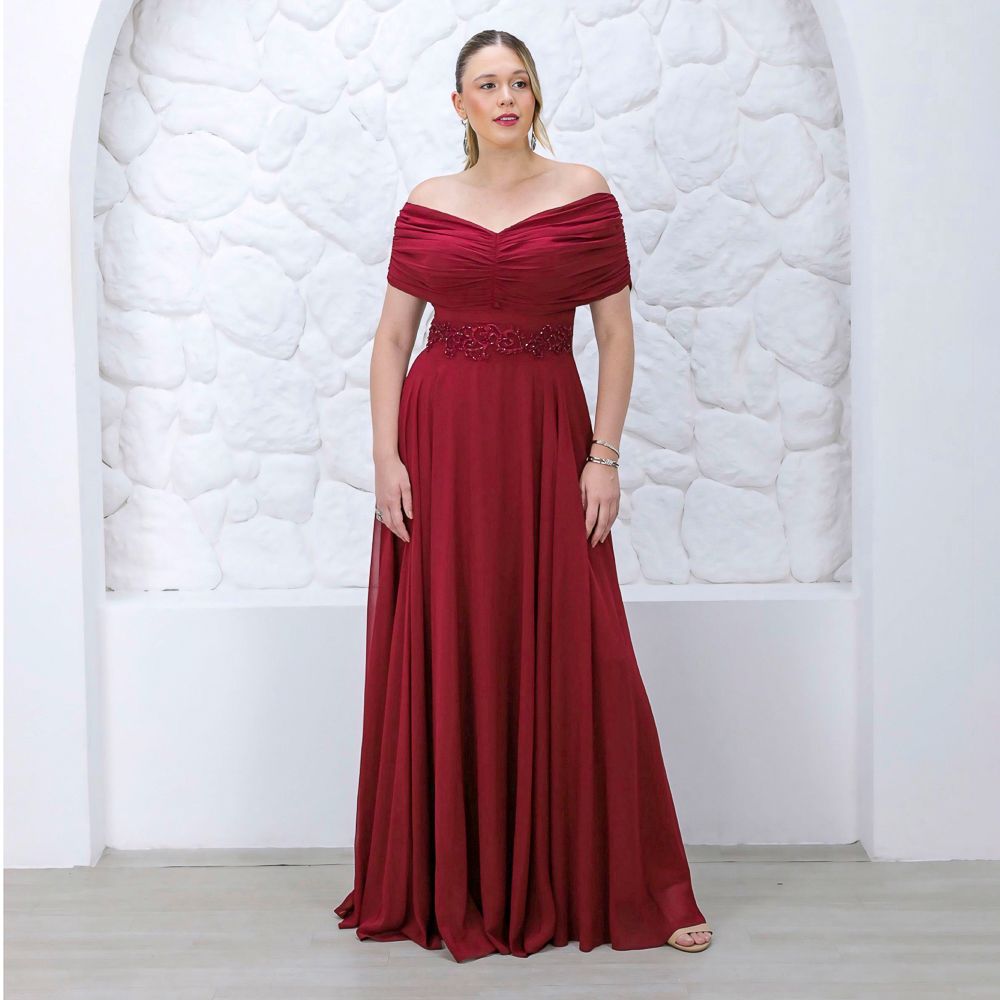 Vestido Denisy Chiffon Ombro A Ombro com Saia Rodada – Marsala