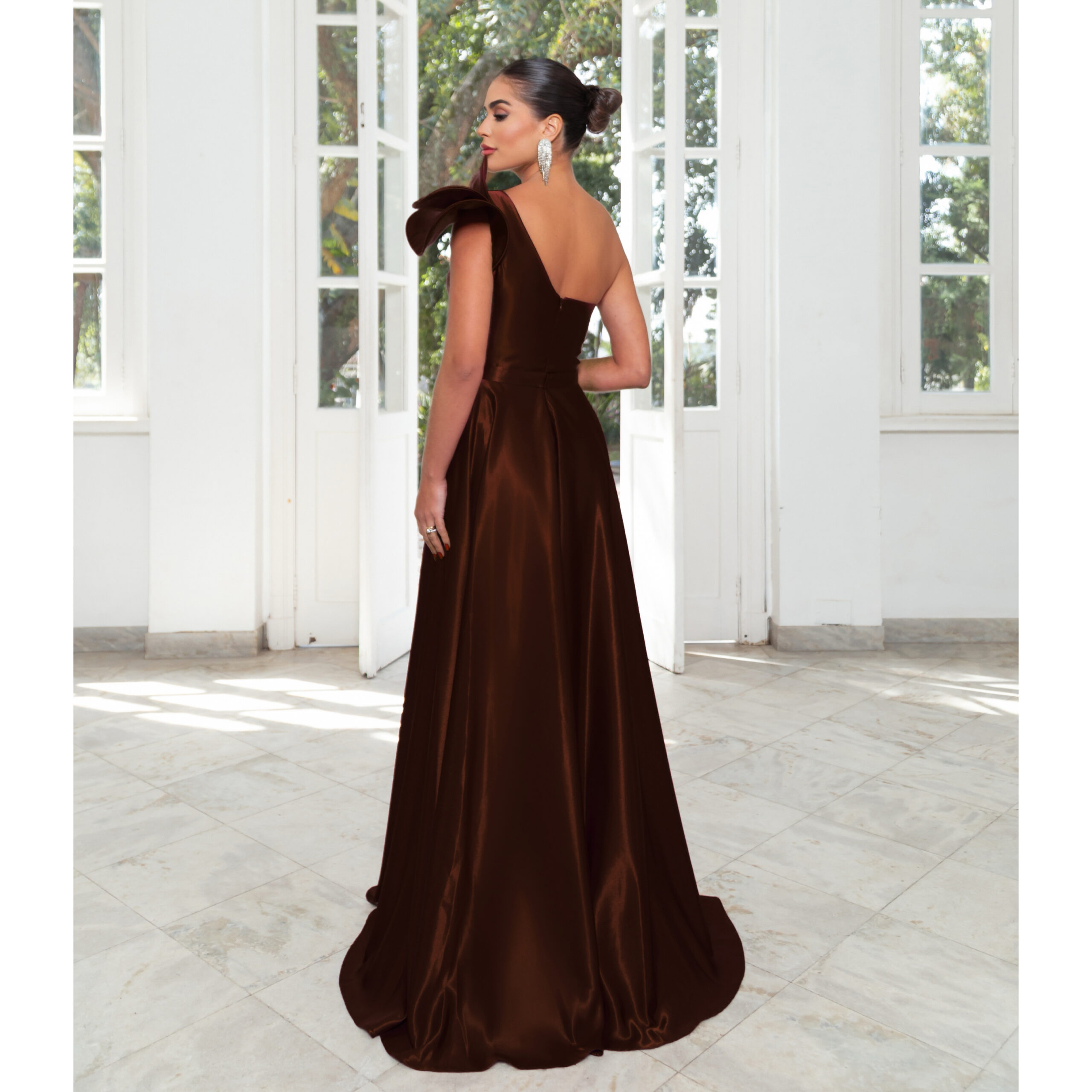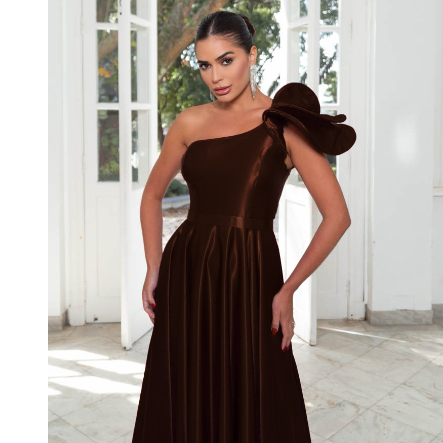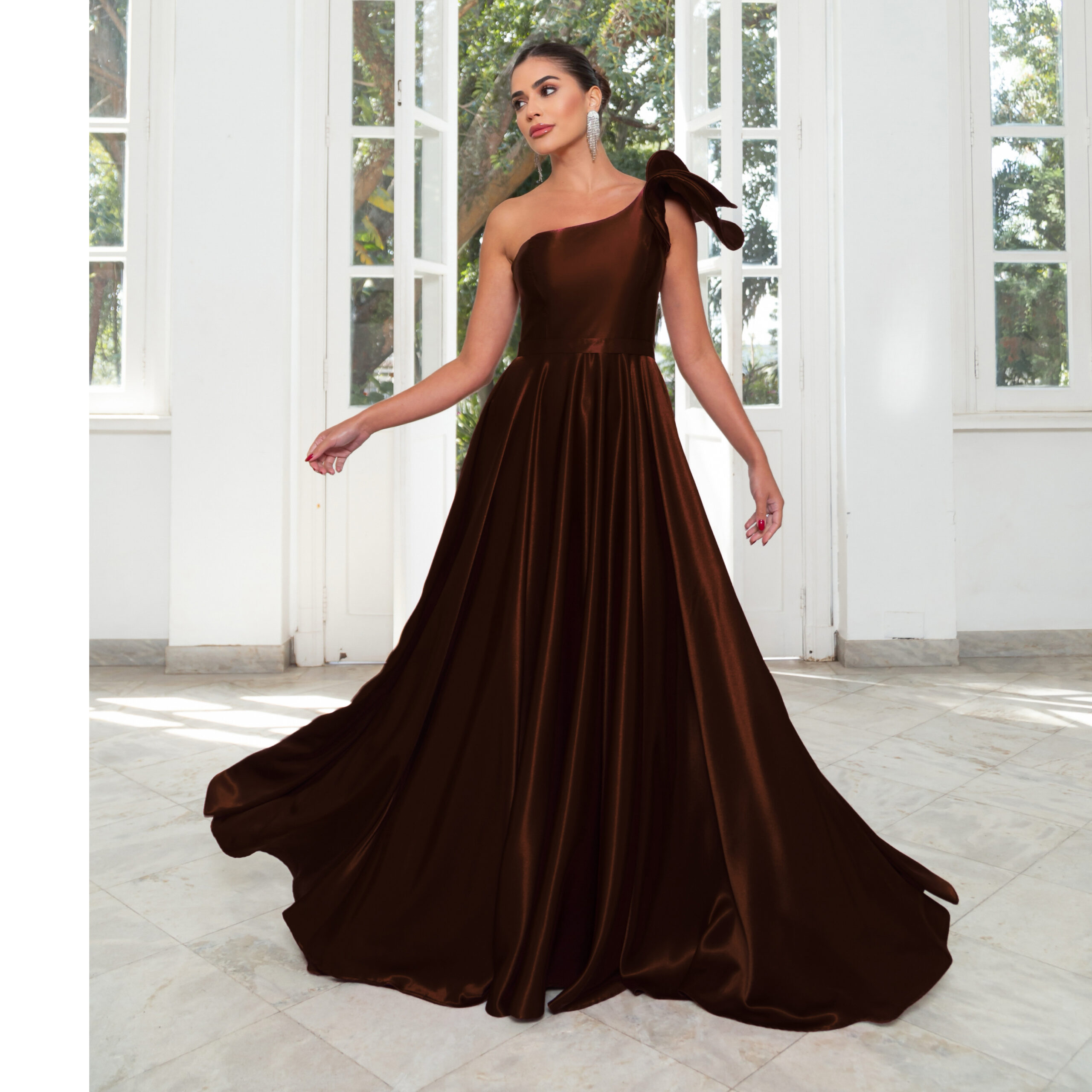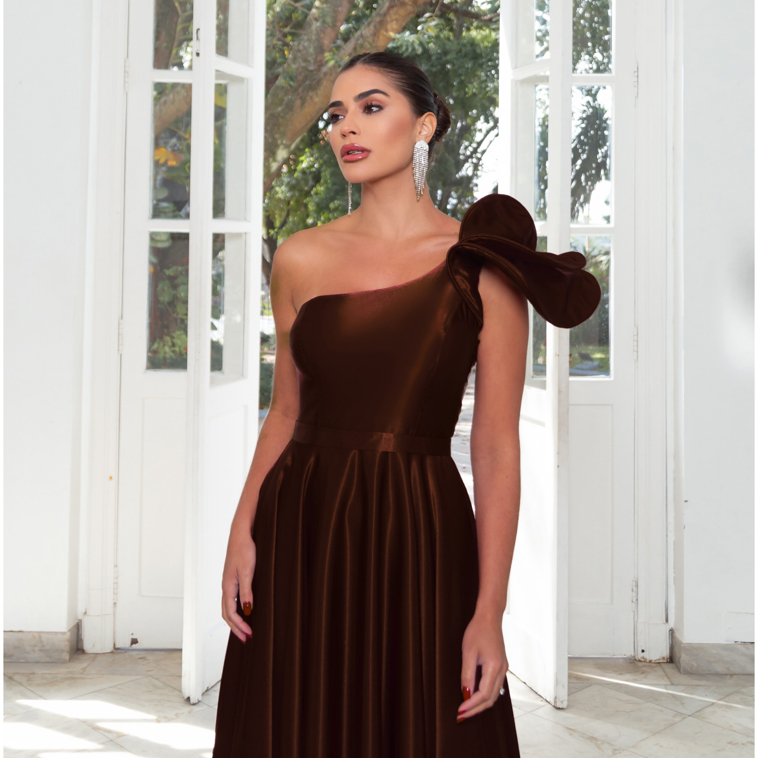 Vestido Earyn um ombro cetim, detalhe ombro saia rodada