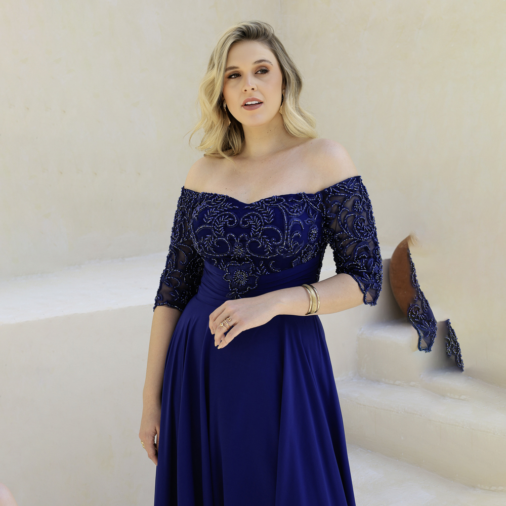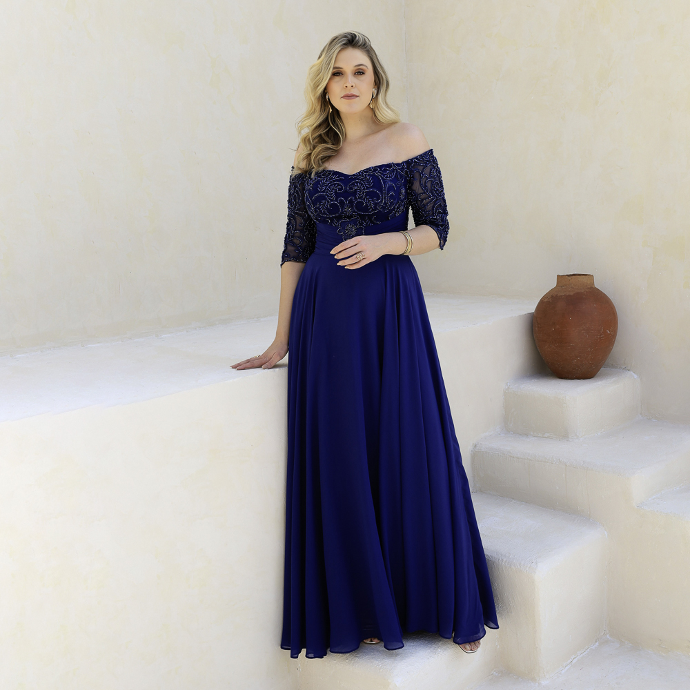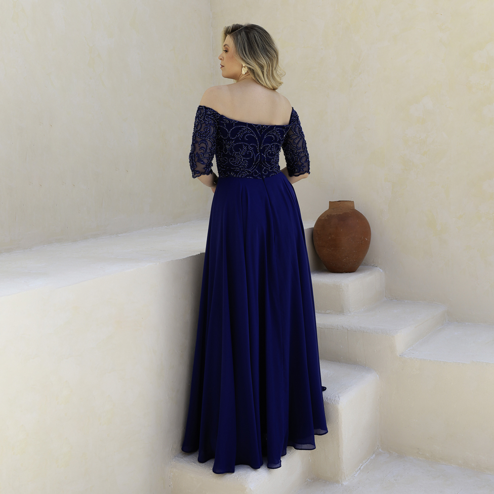 Vestido Emeli Busto Simetrico Bordado, Manga 3/4, Franzido Frontal e Saia Rodada Chiffon – Marinho