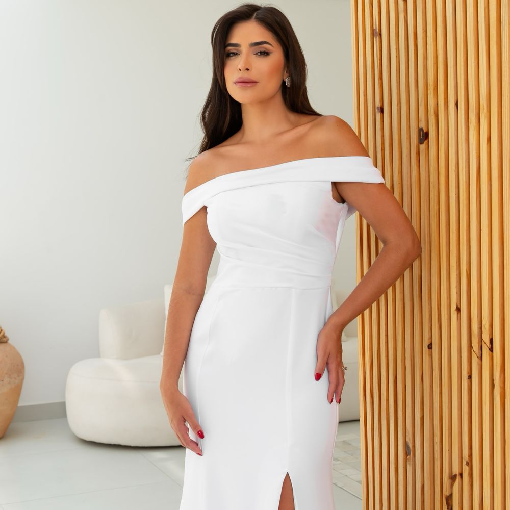 Vestido Esme Noiva Alfaiataria Ombro A Ombro com Prega e Saia Fenda – Branco