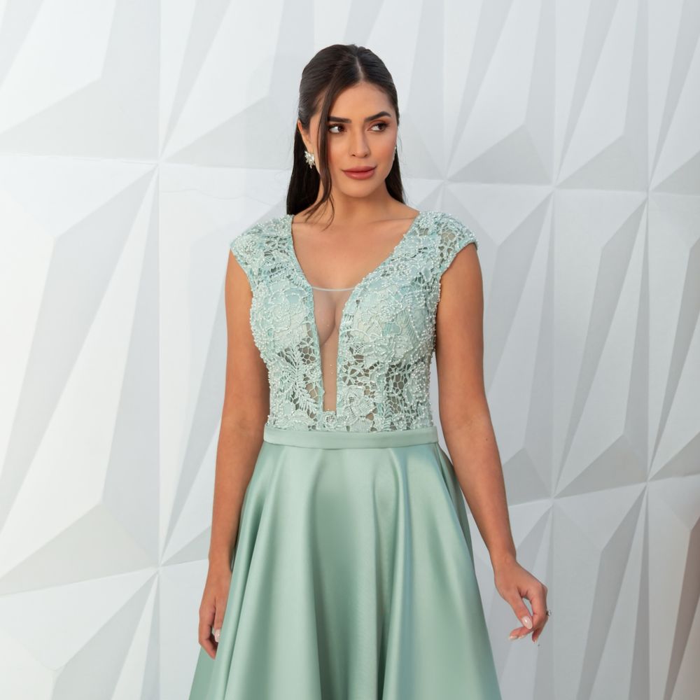 Vestido Eva Zibeline Busto Bordado, Leve Manga e Saia Rodada – Turquesa
