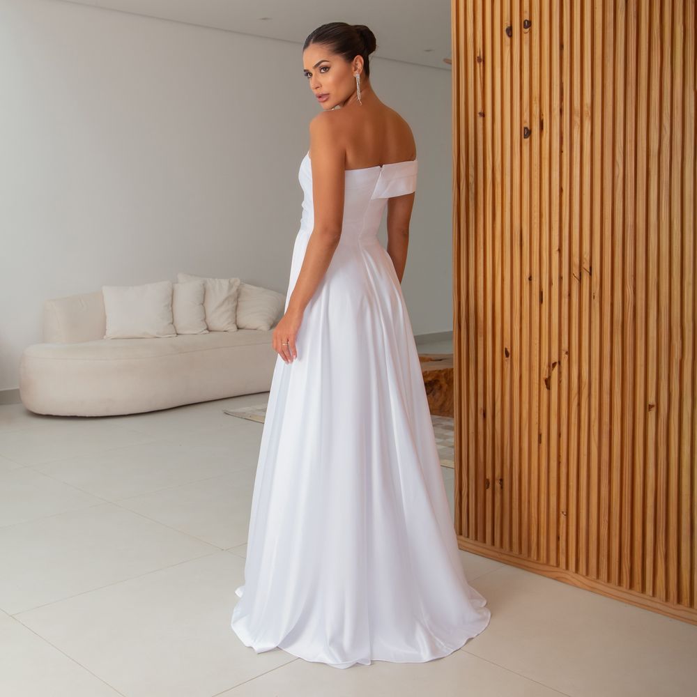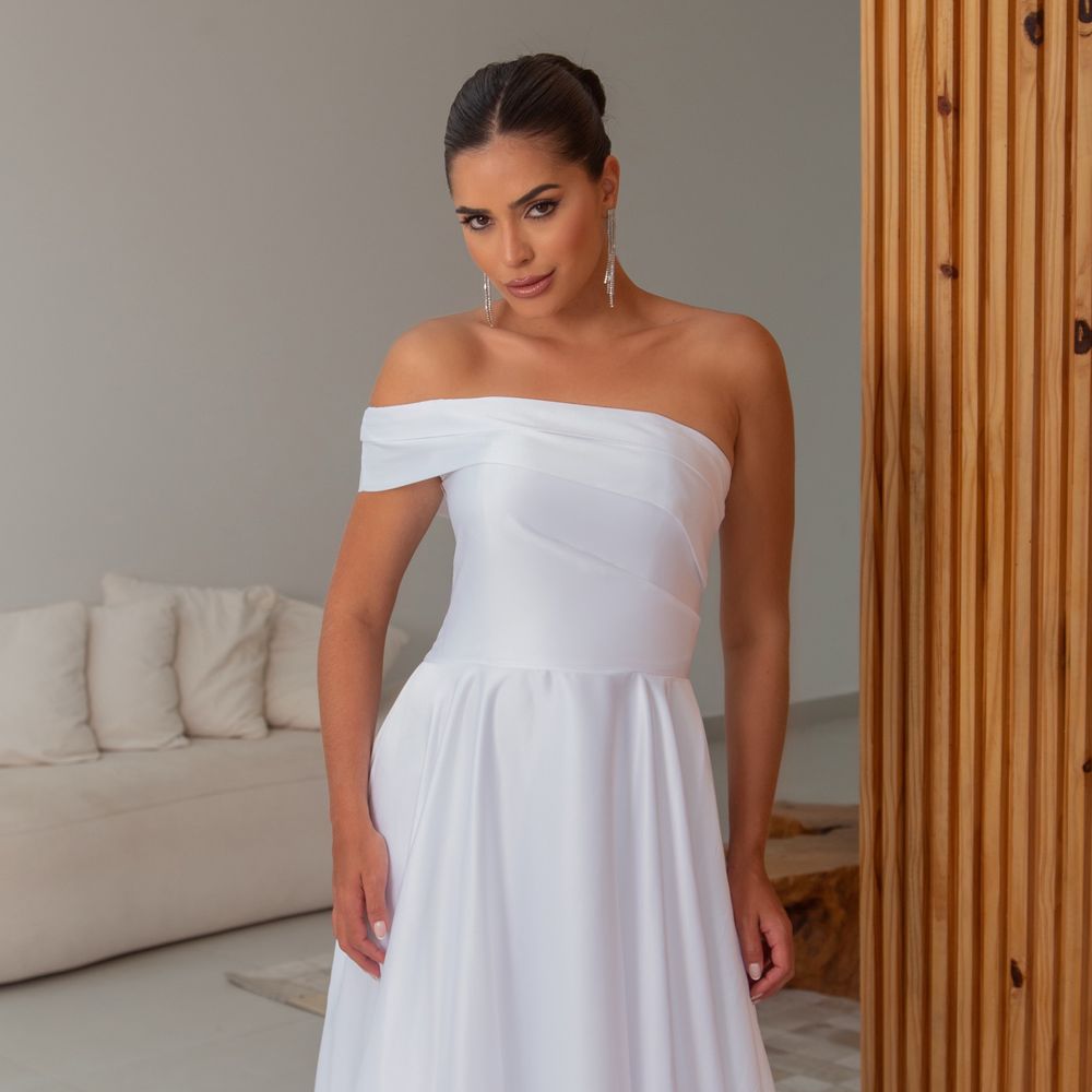 Vestido Fatima Noiva Cetim, um ombro, prega frontal e saia rodada