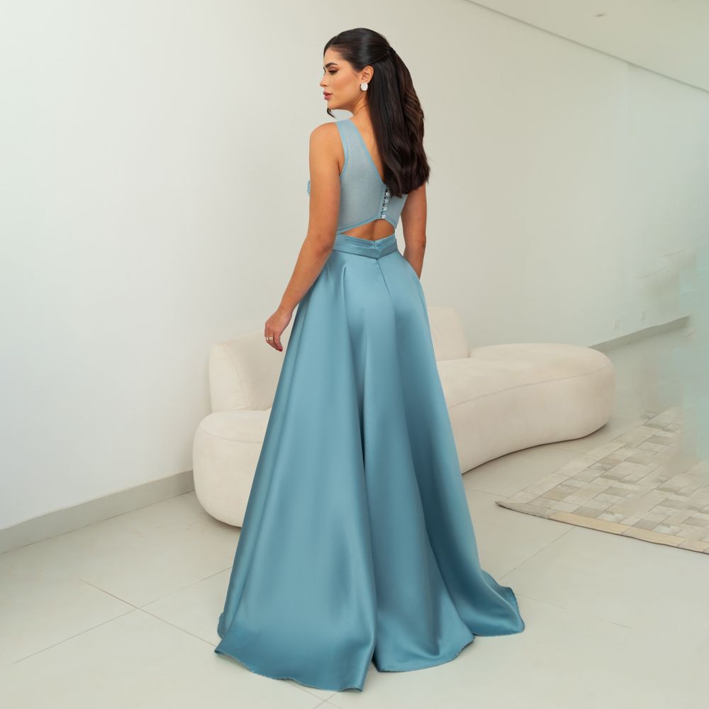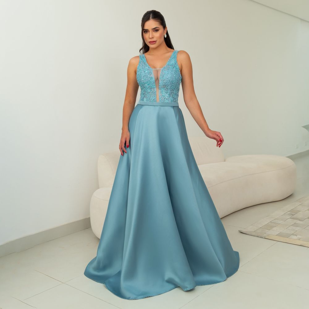 Vestido Fiona Zibeline, Busto Bordado e Saia Rodada – Azul Ceu