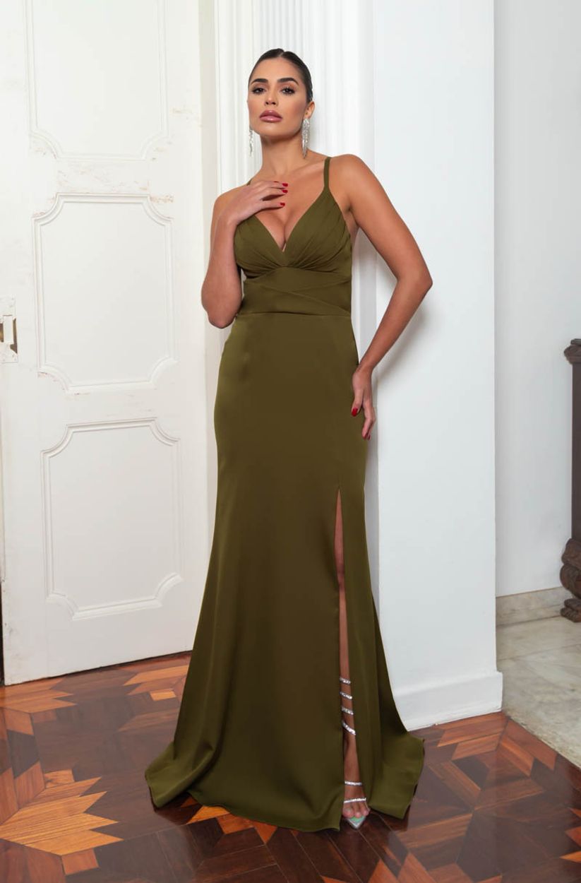 Vestido Gia Alfaiataria Busto Prega, Detalhe Cintura Saia Fenda – Oliva