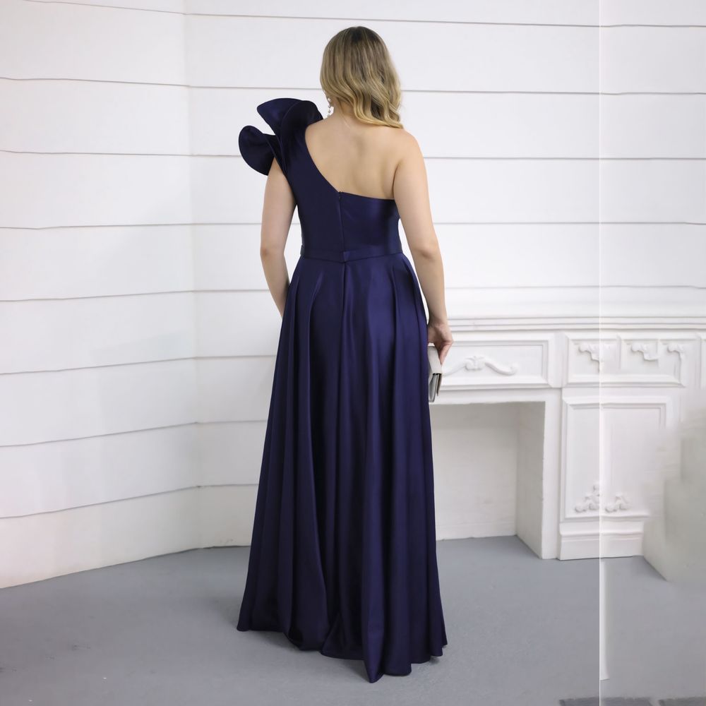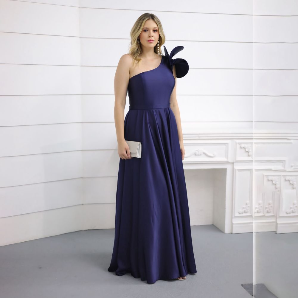 Vestido Jenna Cetim Amanda Um Ombro com Detalhe e Saia Rodad – Marinho