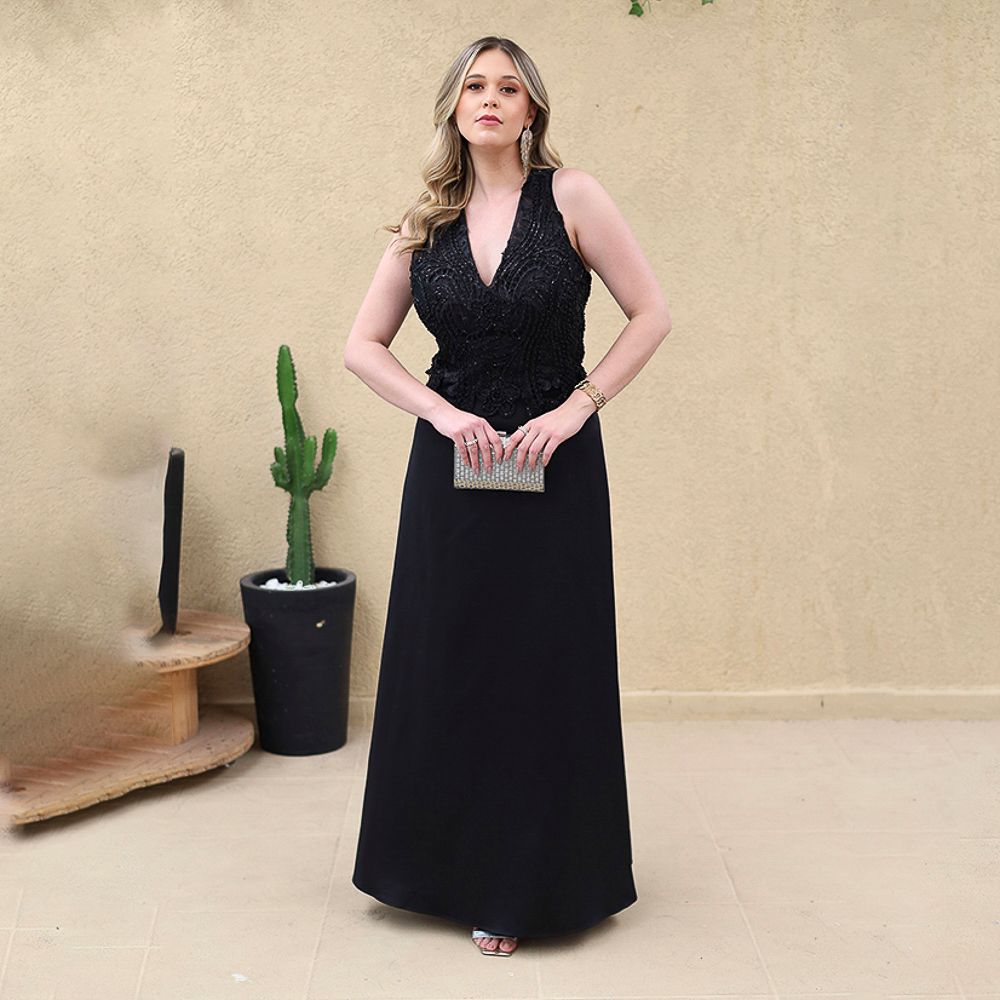 Vestido Julina Busto Bordado Regata Saia Cetim Evasê – Preto