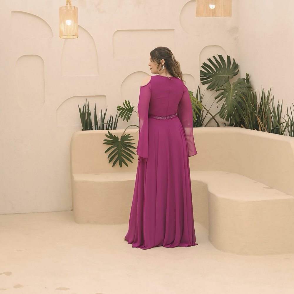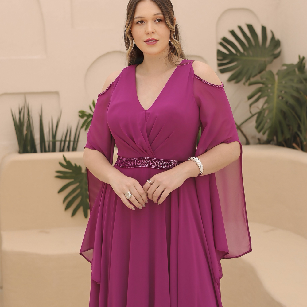 Vestido Kaylyn Chiffon Busto Prega, Cintura Bordada e Capa – Fuchsia