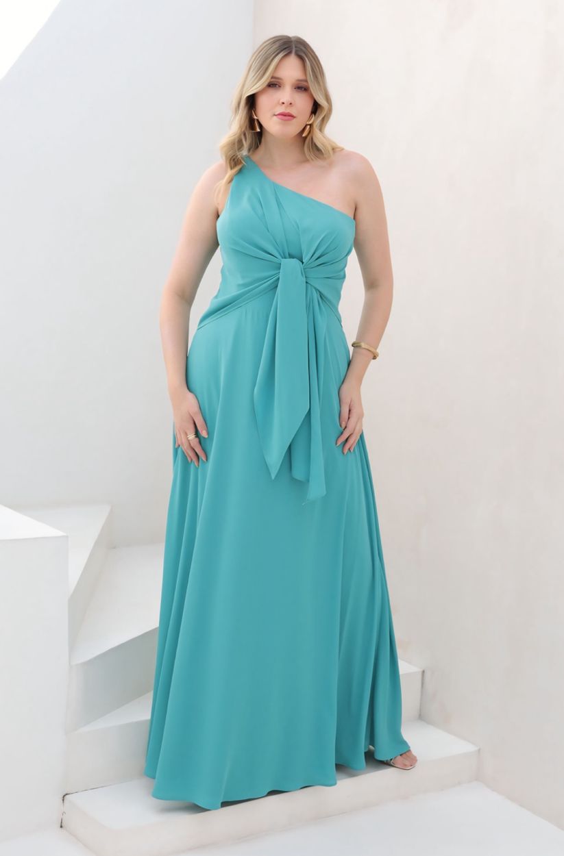Vestido Kinley Um Ombro, Laço Frontal, Crepe Ggt e Saia Roda