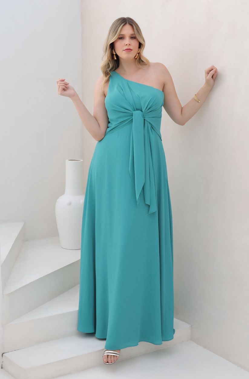 Vestido Kinley Um Ombro, Laço Frontal, Crepe Ggt e Saia Roda – Verde