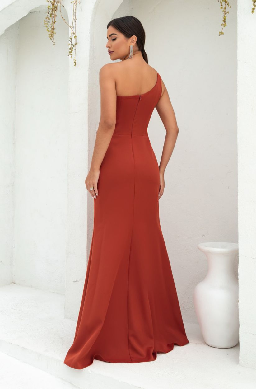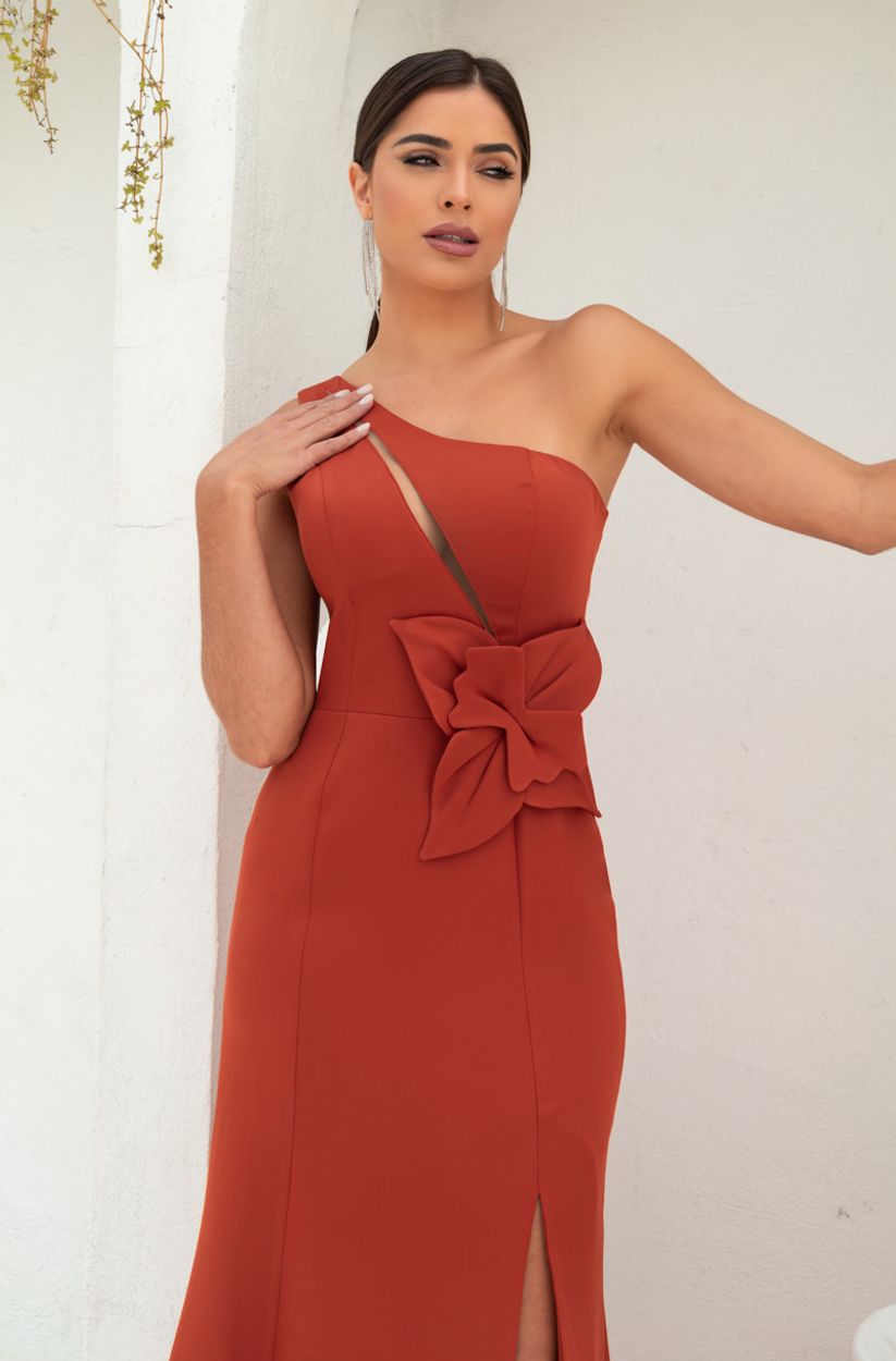 Vestido Lennon Alfaiataria Um Ombro, Detalhe Flor e Saia Fenda – Terra Cota