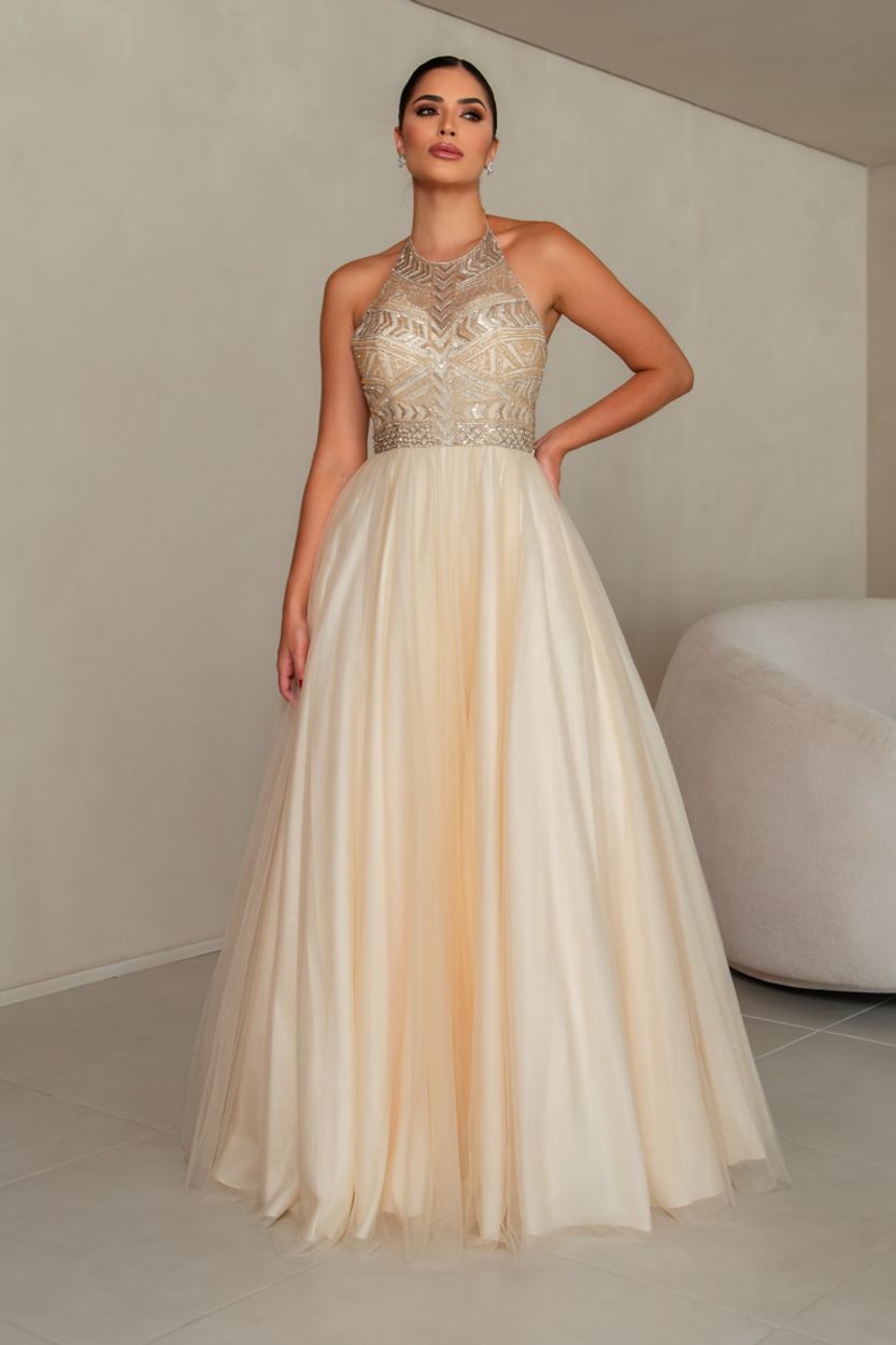 Vestido Mackenzie Importado Busto Bordado Prateado e Saia de – Dourado