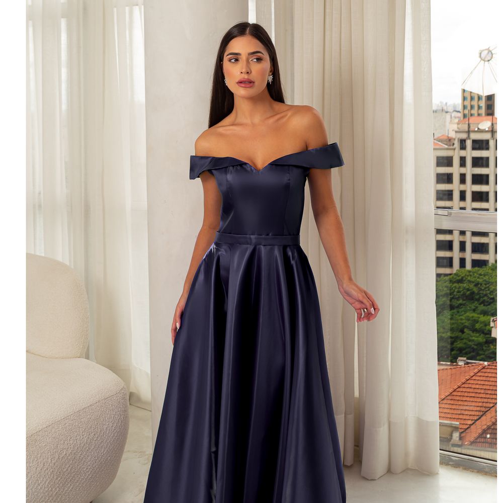 Vestido Nalani Zibeline Shine Ombro Ombro Saia Rodada – Marinho