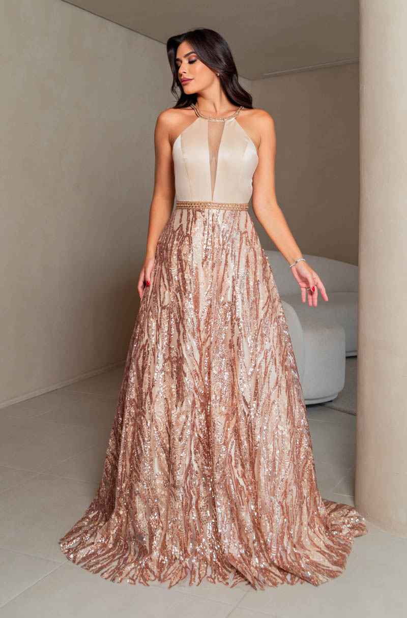 Vestido Nicole Importado Busto Liso, Gola Bordada e Saia Rod – Dourado