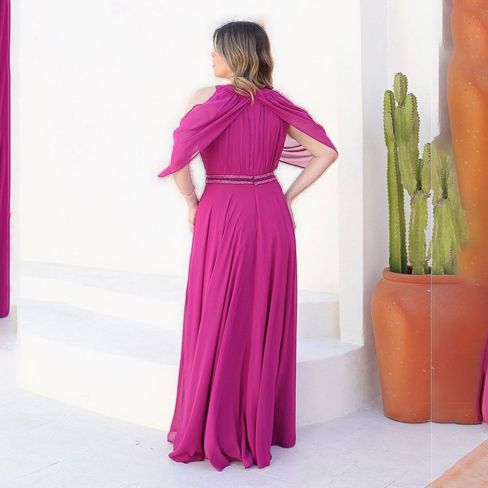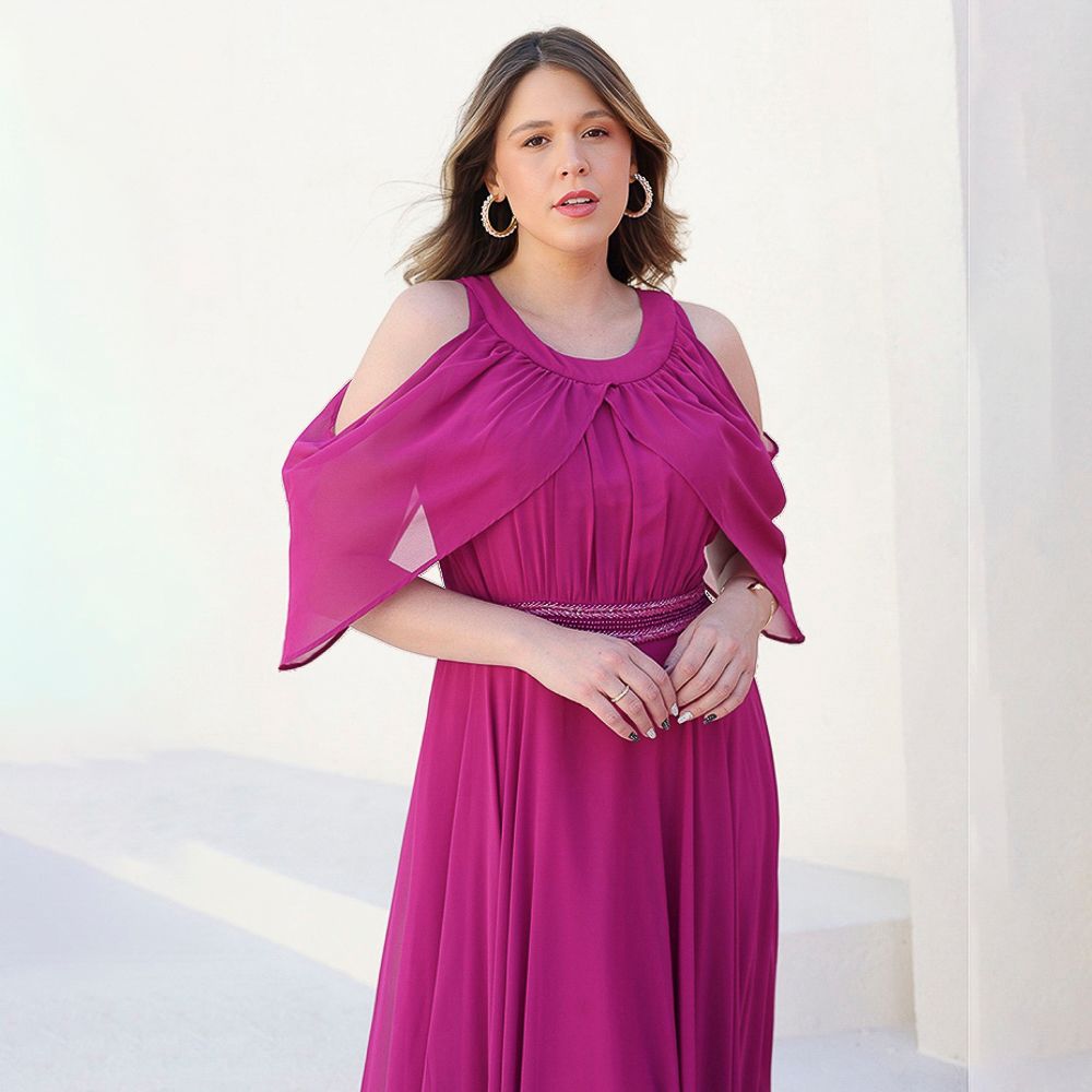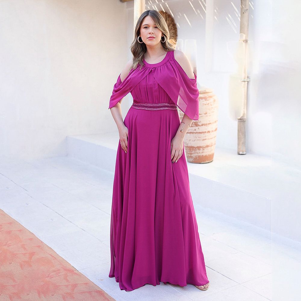 Vestido Nina Chiffon Pala Bordado, Detalhe Manga e Saia Rodada – Fuchsia