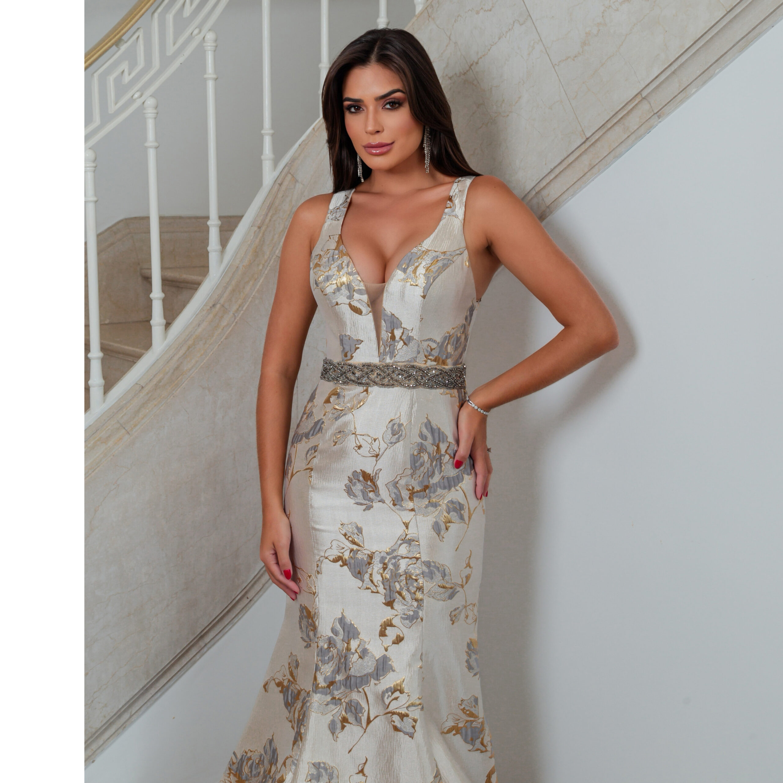 Vestido Nyla Importado Jacquard, Pala Bordada e Saia Sereia – Estampado
