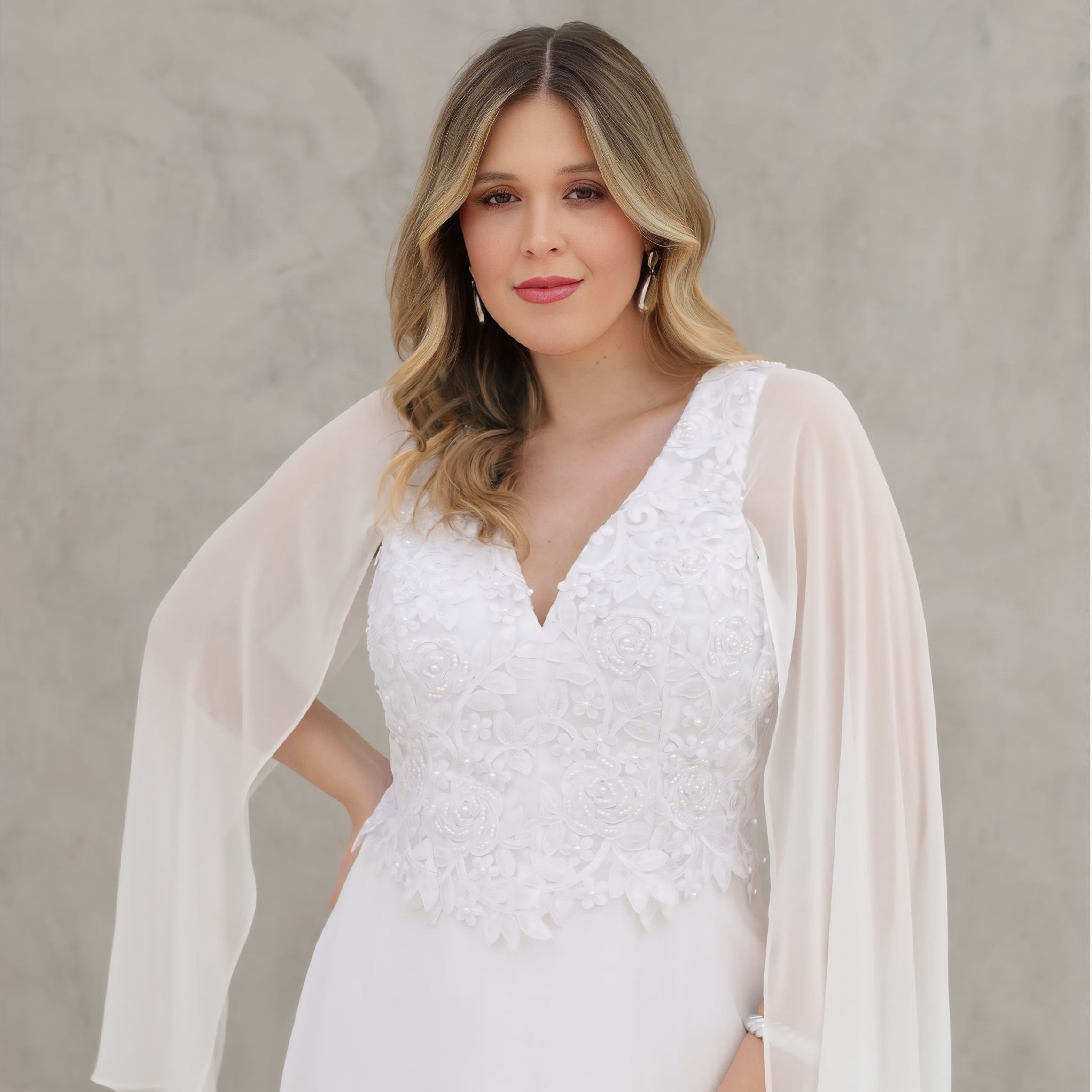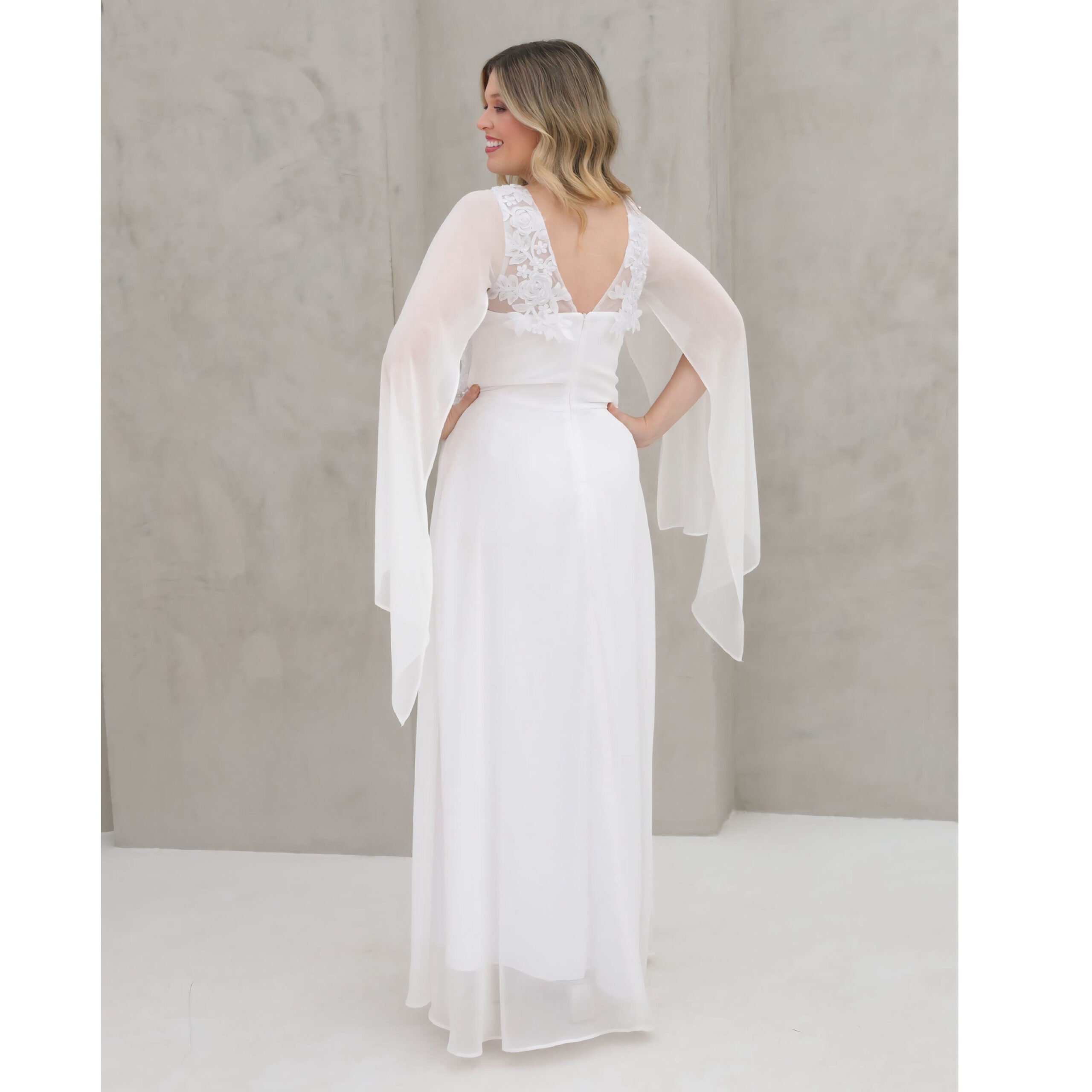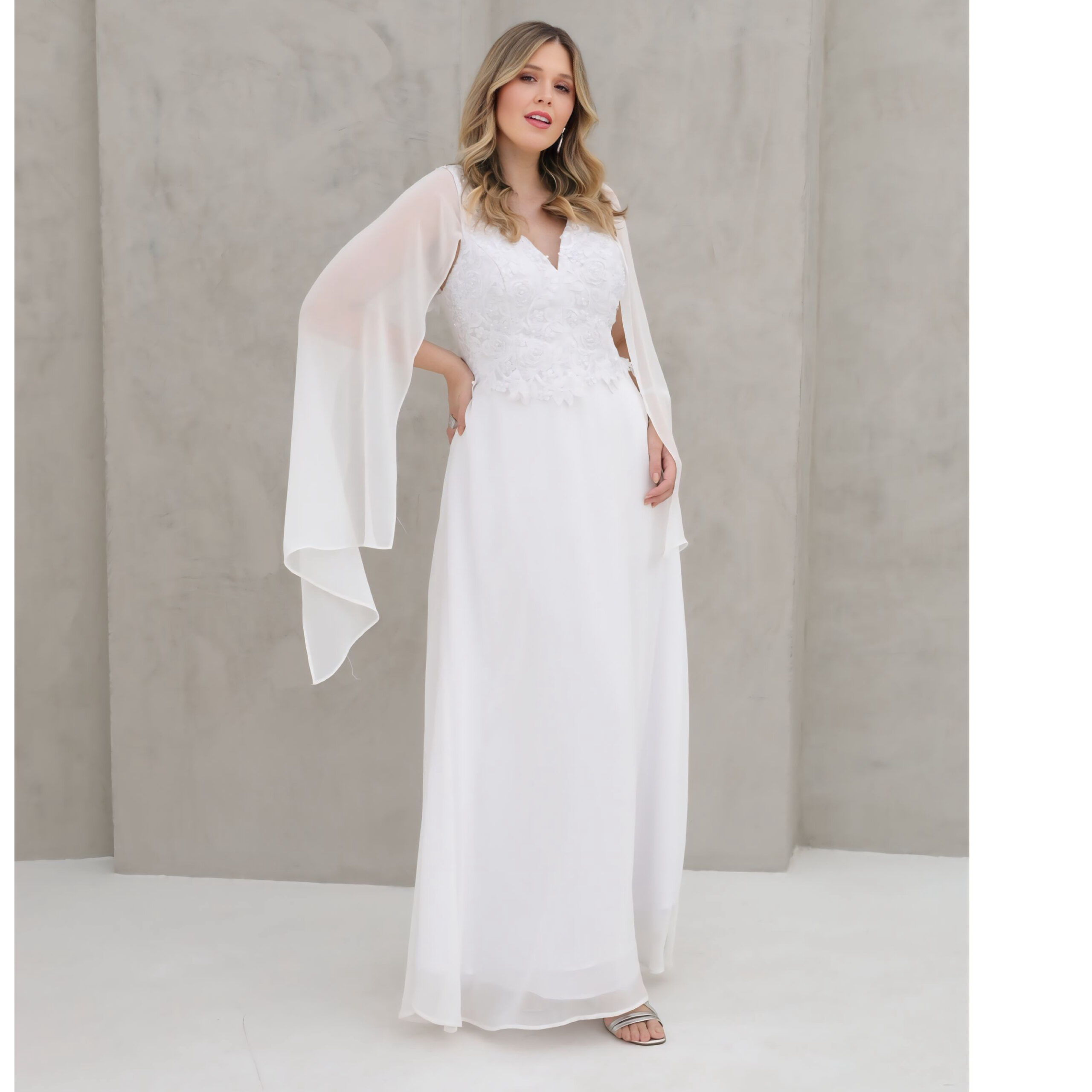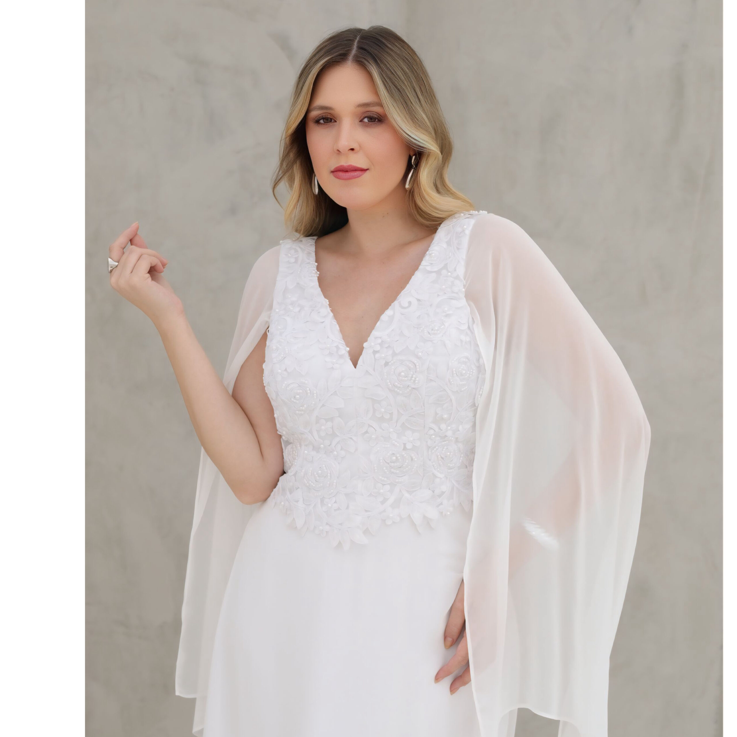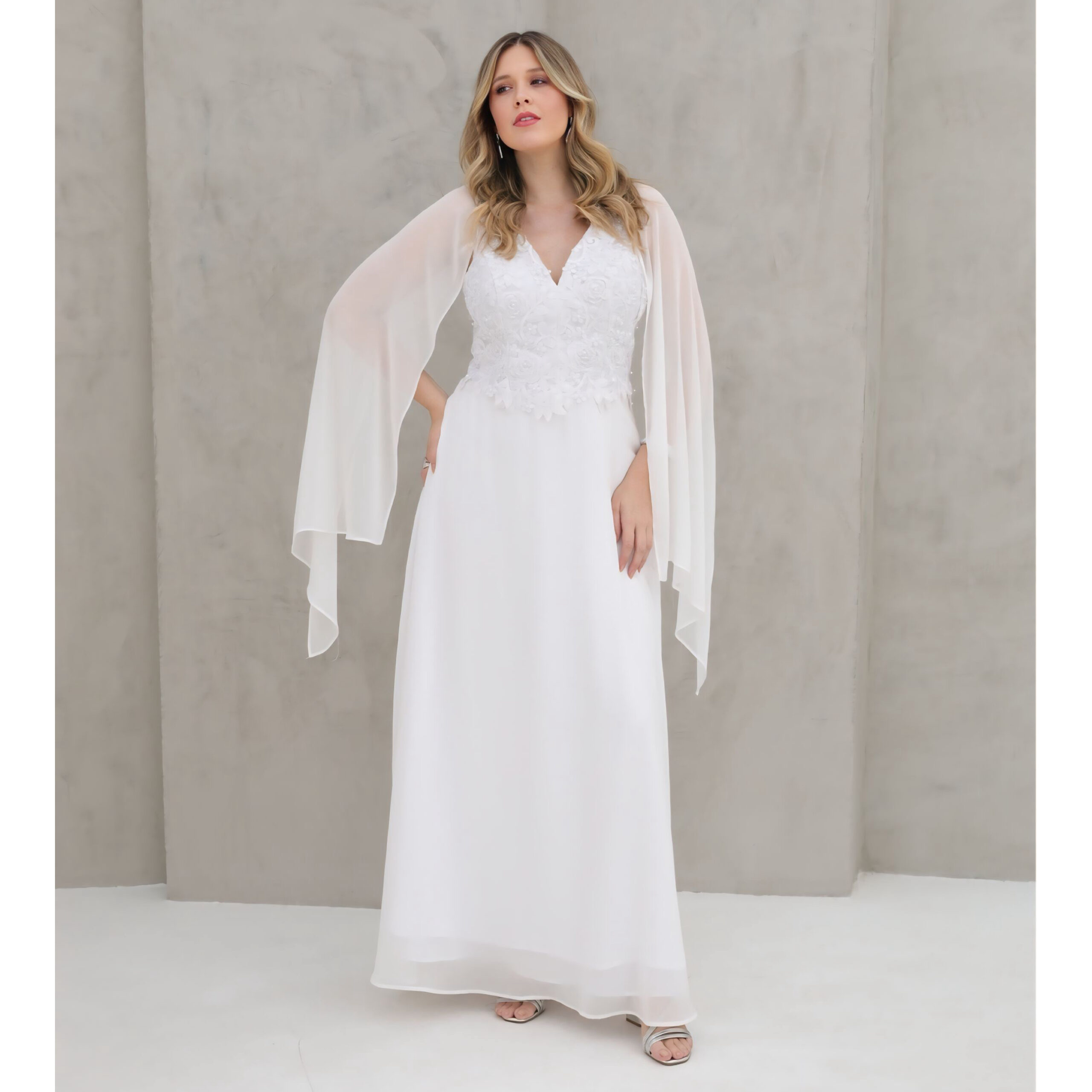 Vestido Regina Noiva Chiffon Busto Bordado Perola, Capa e Saia Rodada – Branco