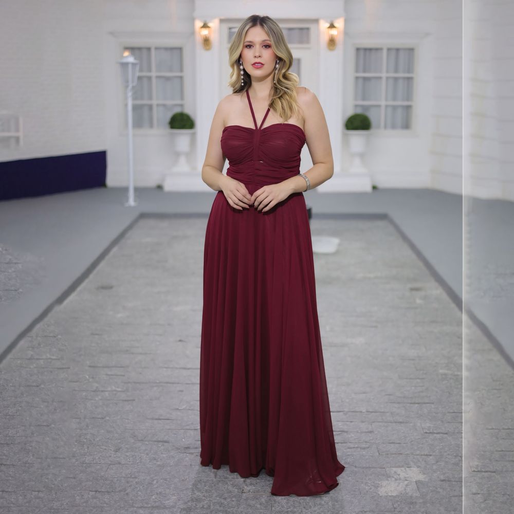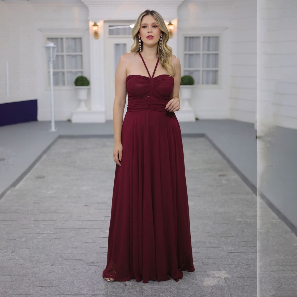 Vestido Remi Chiffon Busto Franzido e Saia Rodada – Bordo