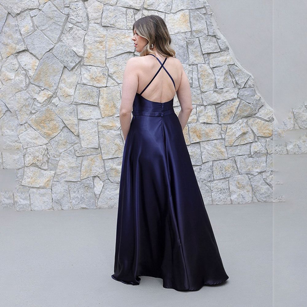 Vestido River Cetim Degrade, Busto Plissado e Saia Fenda – Marinho