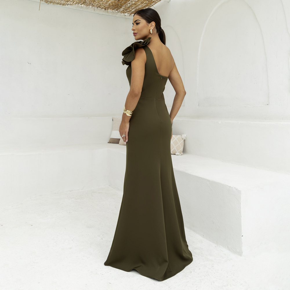 Vestido Ruth Alfaiataria Um Ombro Prega, Detalhe Flor e Saia Fenda – Oliva