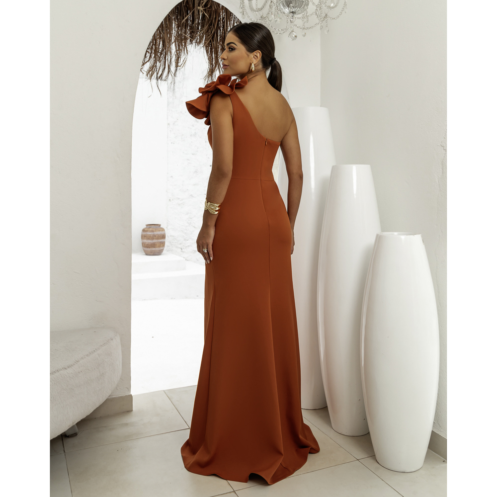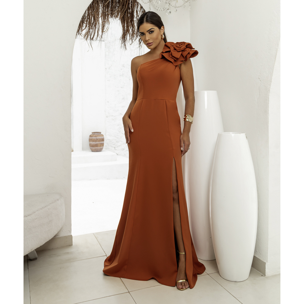 Vestido Ruth Alfaiataria Um Ombro Prega, Detalhe Flor e Saia Fenda – Terra Cota