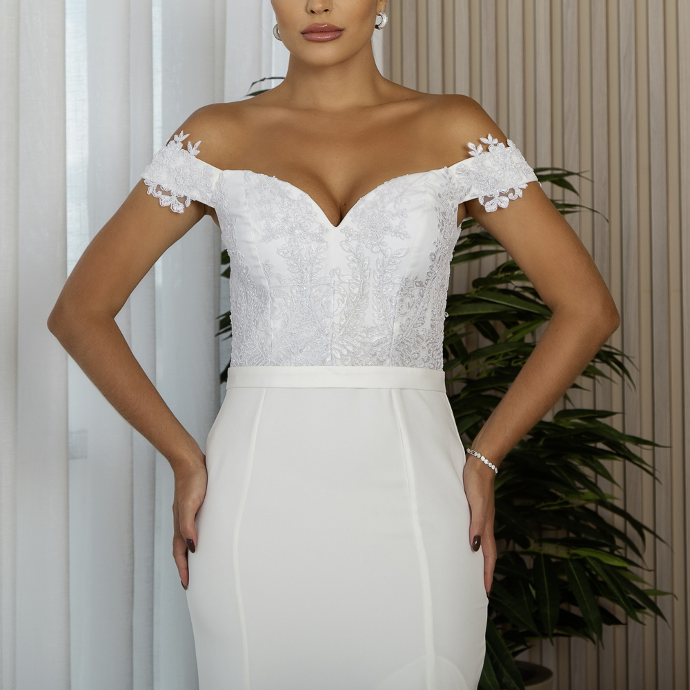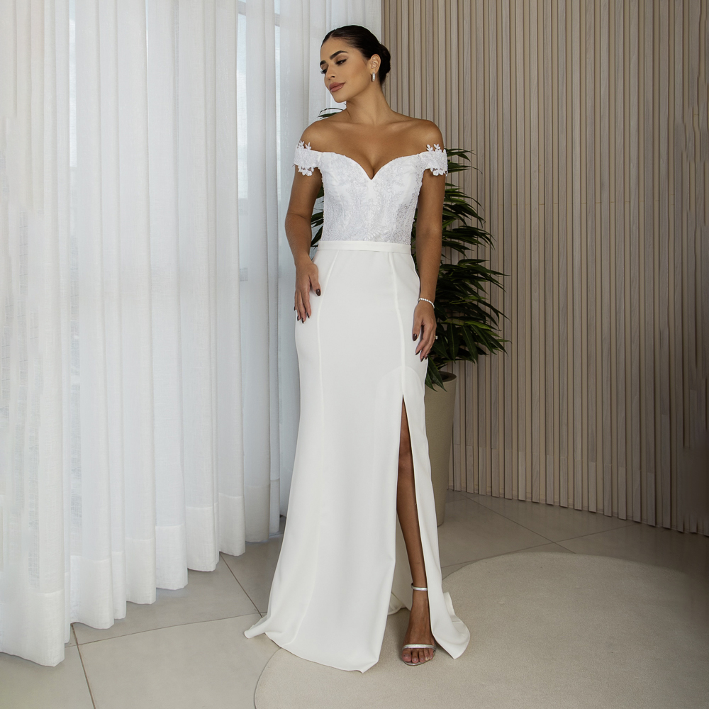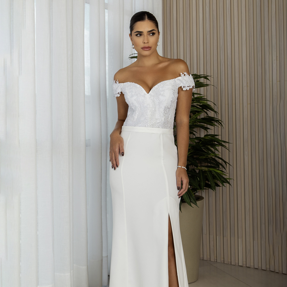 Vestido Seren Noiva Alfaiataria busto bordado ombro a ombro e saia fenda