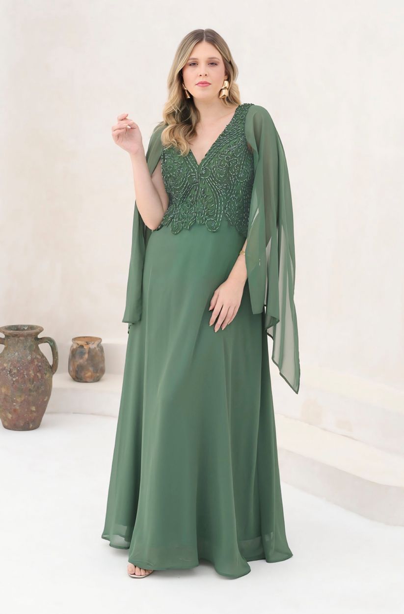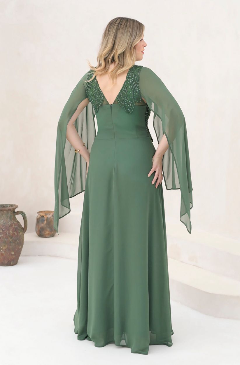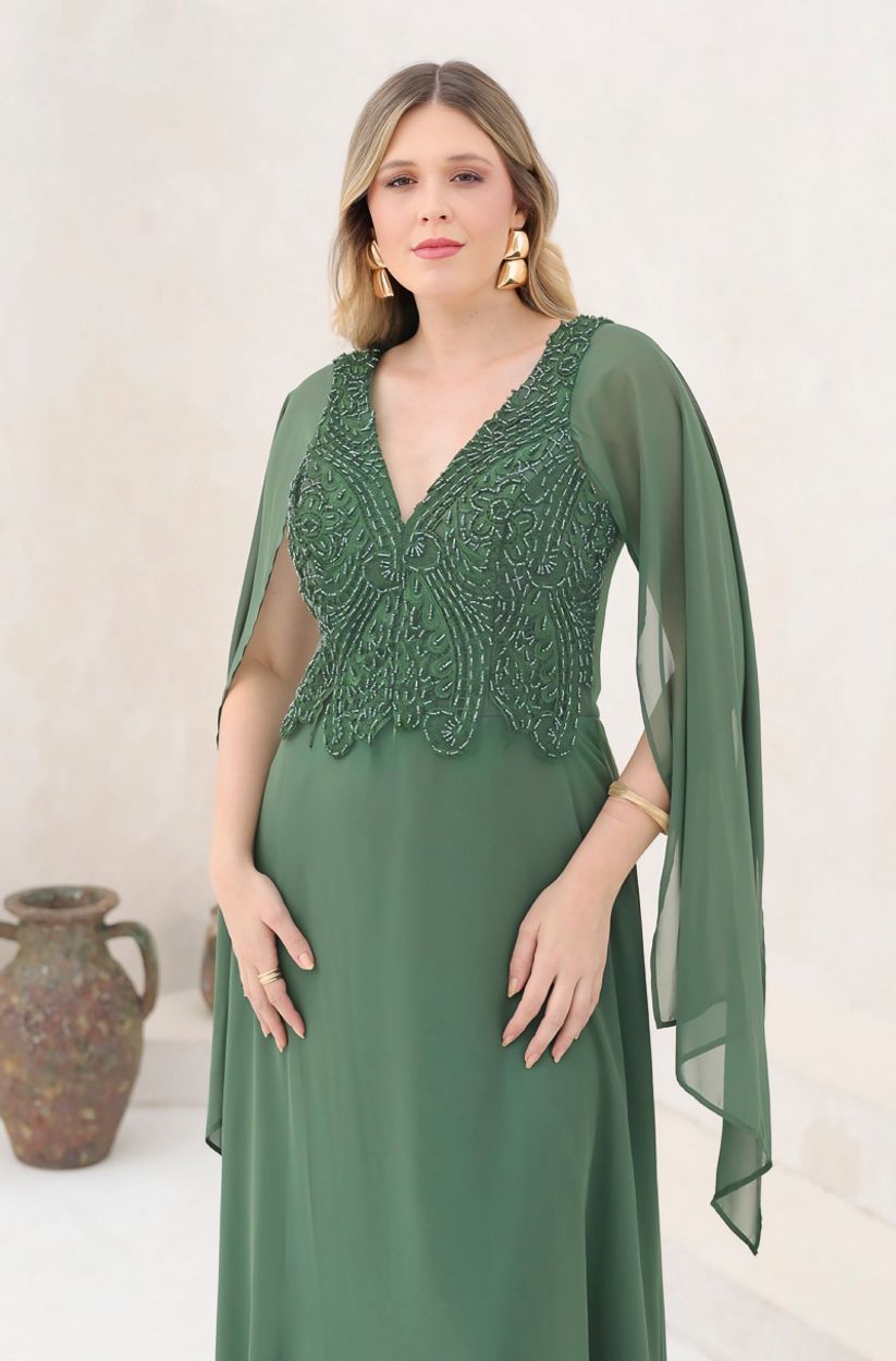 Vestido Teagan Chiffon Busto Bordado, Capa e Saia Rodada – Oliva