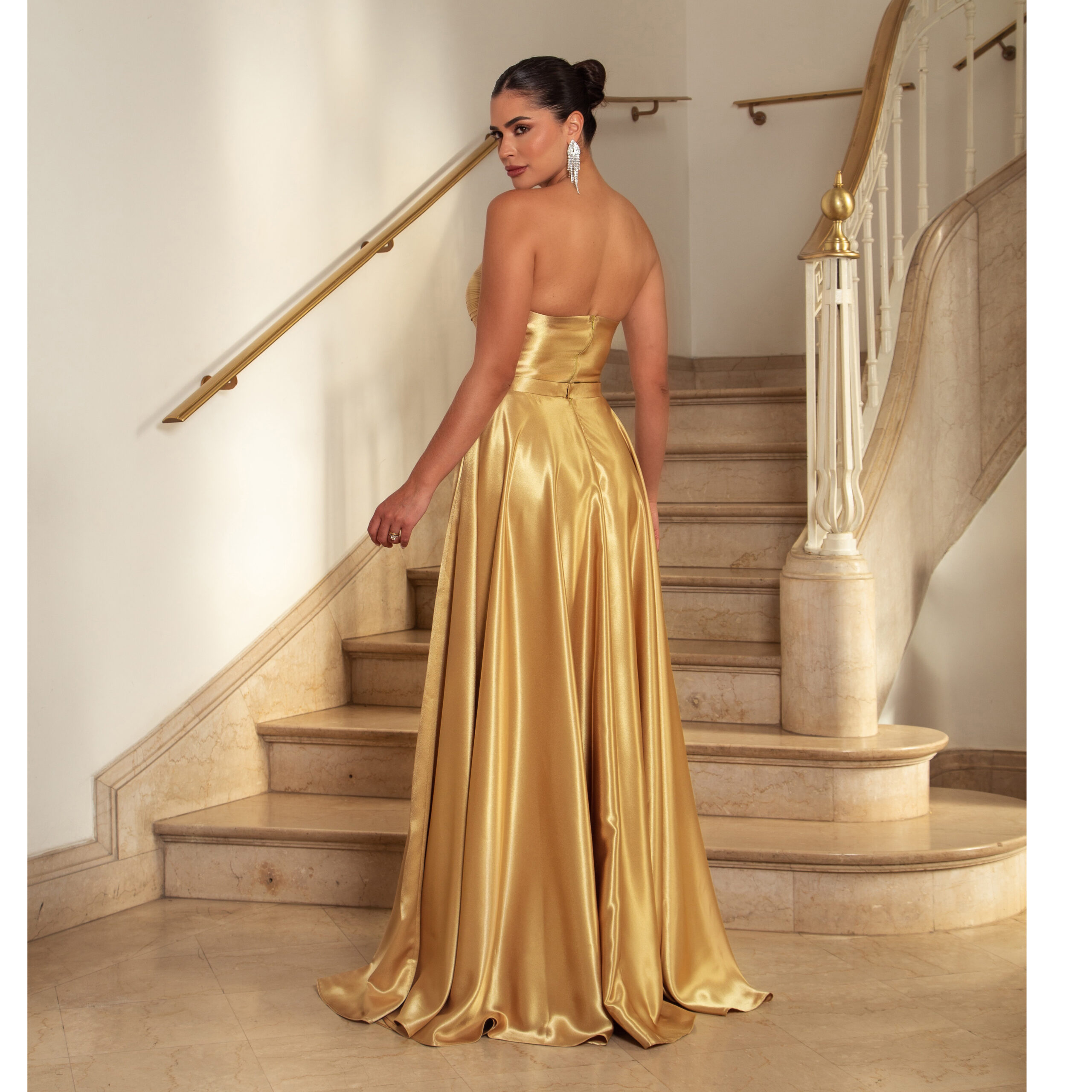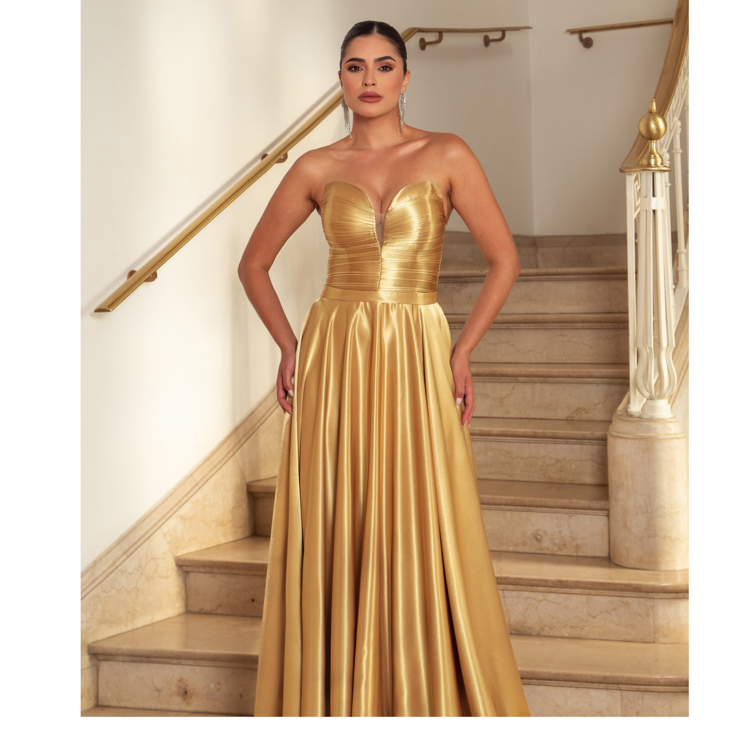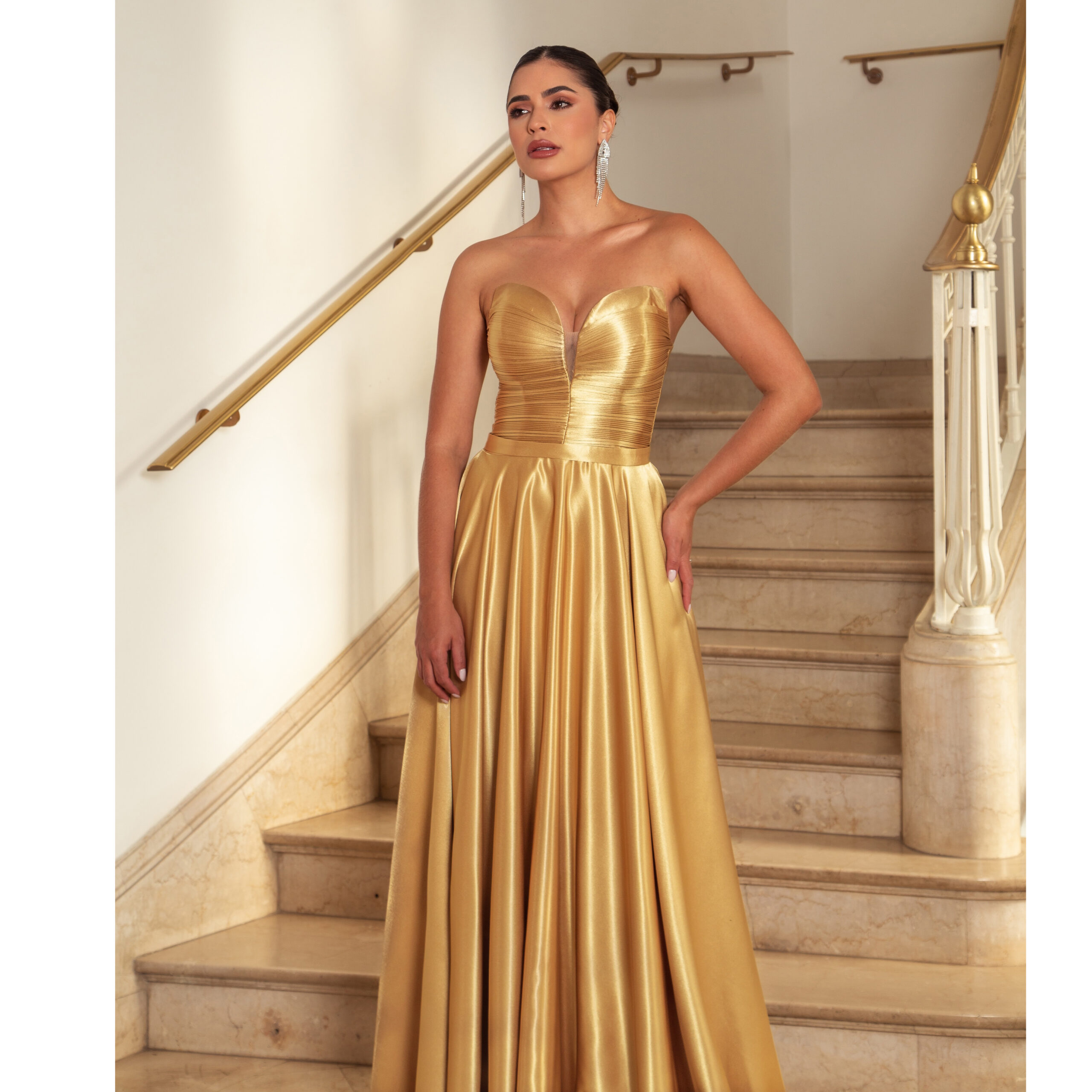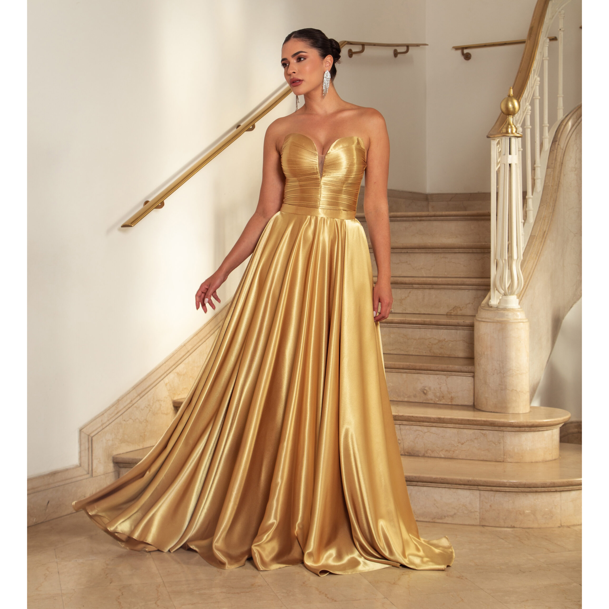 Vestido Thea Decote Plissado Busto e Saia Rodada Cetim – Dourado