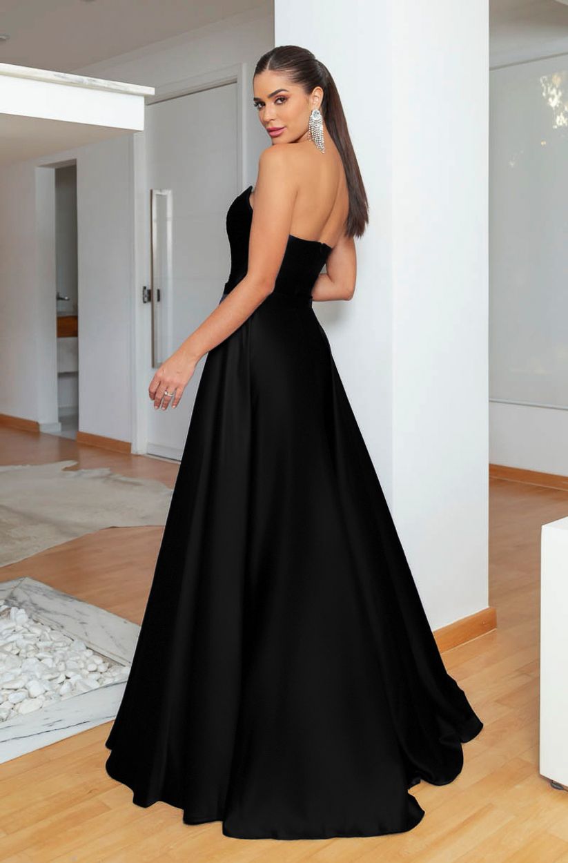 Vestido Thea Decote Plissado Busto e Saia Rodada Cetim – Preto