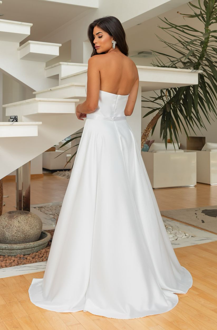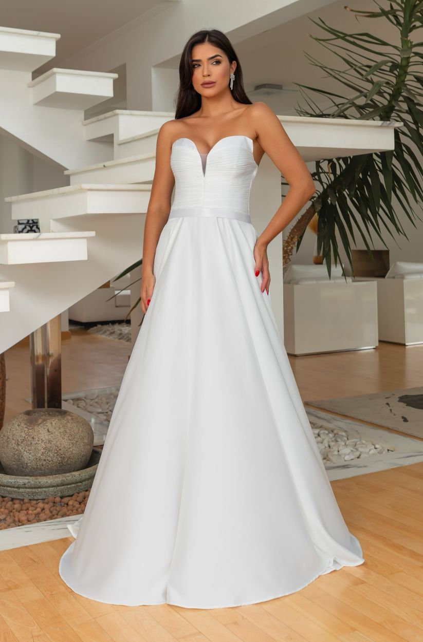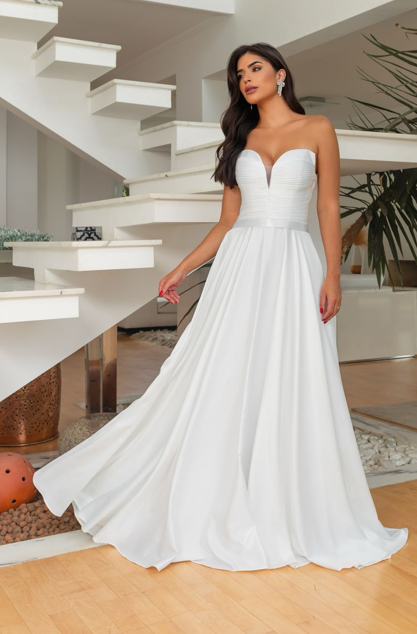 Vestido Thea Noiva Decote Plissado Busto e Saia Rodada Cetim – Branco